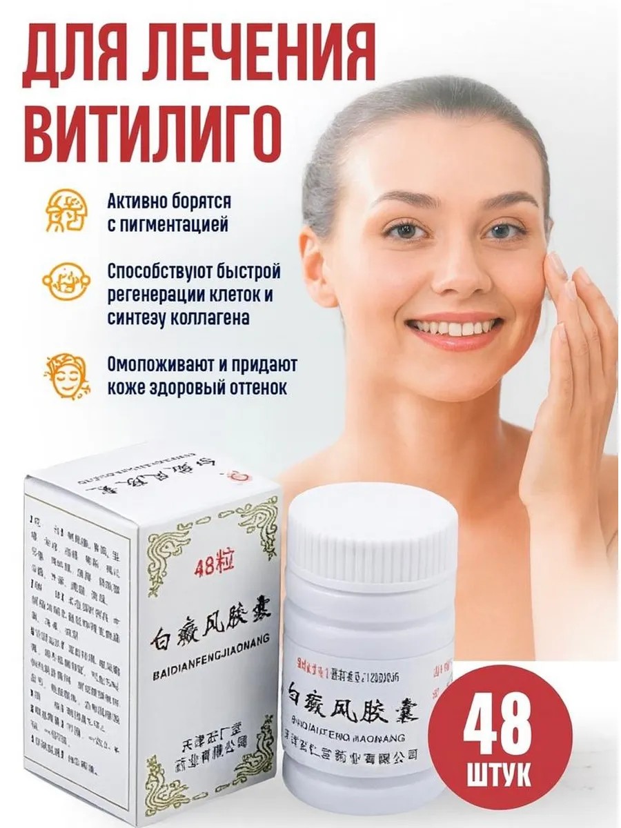 Vitiligoma tablets, even out skin tone, stimulate melanin production, and whiten. Each bottle contains 48 capsules. They even out skin tone, reduce the contrast of existing white spots, and fade them completely. A natural remedy for the treatment of vitiligo. It stops the spread of the disease and reduces its characteristic symptoms to a minimum. The product contains manganese, a deficiency of which is the main cause of vitiligo, as well as a number of important microelements that promote melanin production. Chinese vitiligo tablets "Baidianfeng" even out skin tone, reduce the contrast of existing white spots, and fade them completely, and also guarantee the prevention of new lesions. The product activates the production of the natural pigment melanin (dark pigment) in the skin and helps restore normal pigmentation and an even skin tone*. Vitiligo has an immunomodulatory and antioxidant effect, stimulates skin cell renewal, improves metabolism, and normalizes gastrointestinal microflora. It works well in combination with UV therapy. It also helps achieve a beautiful, even tan. Directions and dosage: 2 capsules twice daily, morning and evening after meals*. The recommended standard course is 3-4 packages. For maximum effect, it is recommended to take the tablets and use the vitiligo ointment.