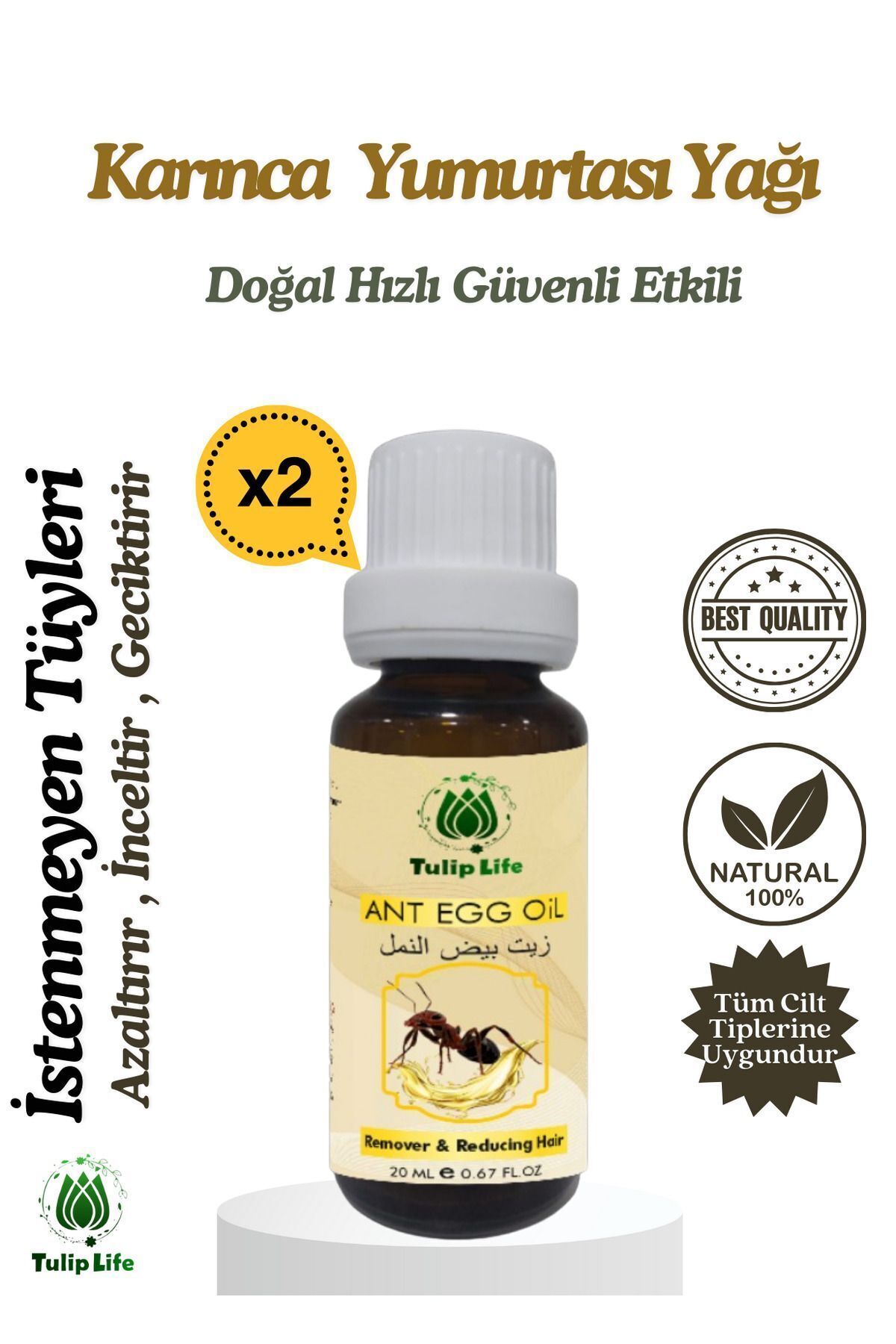 • Cildinizi simartin: Tulip Life Karinca yumurtasi yaginin nemlendirici ve besleyici özellikleriyle cildiniz yeniden dogacak gibi hissedecek. Dogal içeriklerin gücü: Karinca yumurtasi yagi, cildinizi tahris etmeden derinlemesine besler ve yeniler. Parlak ve saglikli bir cilt için: Tulip Life Karinca yumurtasi yagi, cildinizin dogal isiltisini geri kazandirir. Her cilt tipine uygun: Hassas ciltler dahil olmak üzere tüm cilt tipleri için uygundur.