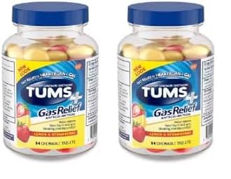 #1 doctor recommended: TUMS antacids are the #1 recommended adult antacid brand by doctors, pharmacists and OBGYNs. Gluten free: These TUMS antacid tablets contain calcium carbonate to relieve heartburn. Fast and powerful strength: These chewable antacid tablets go to work instantly by starting to neutralize acid on contact. Multi-symptom relief: Tablets work quickly to relieve heartburn, sour stomach, acid indigestion and upset stomach associated with these symptoms. This product also contains simethicone to relieve gas. Contents: 54 TUMS Chewy Bites Chewable Antacid Tablets with Gas Relief in tasty lemon and strawberry flavors. The information below is per-pack only.