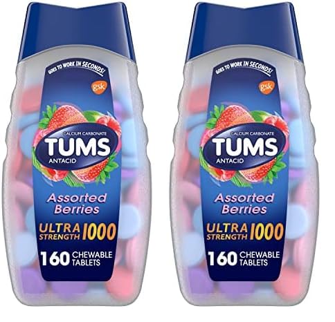 HSA AND FSA ELIGIBLE: HSA and FSA eligible product. TRUSTED BRAND: America’s #1 antacid, providing trusted heartburn relief for 90 years, supported by a satisfaction guarantee. #1 DOCTOR RECOMMENDED: TUMS antacids are the #1 recommended adult antacid brand by doctors, pharmacists and OBGYNs. HSA and FSA eligible product. GLUTEN FREE AND KOSHER: This heartburn and acid indigestion medicine has the active ingredient 1000 mg calcium carbonate. FAST AND POWERFUL STRENGTH: Nothing works faster! This ultra strength antacid goes to work instantly by starting to neutralize acid on contact. MULTI-SYMPTOM RELIEF: This acid indigestion remedy treats the four signs of heartburn: burning in the chest, acid indigestion, sour stomach and upset stomach associated with these symptoms. CONTENTS: 1 bottle containing 160 TUMS Ultra Strength Chewable Antacid Tablets for Heartburn Relief in easy to take, delicious Assorted Berry flavors - Strawberry and Raspberry. The information below is per-pack only.