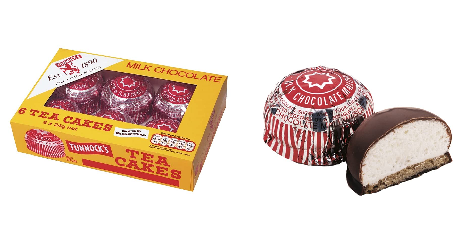 Ingredients: 38 mousse fondant (sugar, glucose syrup, protein), 34 milk chocolate (sugar, cocoa (min. 25 ), whole milk (min. 25 ), blend of palm oil and shea butter, emulsifier: soy lecithin, flavoring), 28 biscuit (wheat flour (wheat, calcium carbonate, iron, niacin, thiamine), blend of palm oil and grated oil, sugar, chocolate (cocoa (min. 25 ), whole milk (min. 14 ), sodium bicarbonate, sodium carbonate, disodium diphosphate) - Nutritional information per 100g: energy value 1842 kJ 442 kcal, fat 19.2g, of which saturates 10.4g, carbohydrates 62.1g, of which sugars 35.8g, fiber 2.5g Protein 5g, Salt 0.71g INGREDIENTS Frosting sugar 38 (sugar, glucose syrup, egg white), milk chocolate 34 (sugar, cocoa (min. 25 ), whole milk (min. 25 ), blend of palm oil and shea butter, emulsifier: soy lecithin, flavoring), biscuit 28 (wheat flour (wheat, calcium carbonate, iron, niacin, thiamine), blend of palm oil and grated oil, sugar, chocolate (cocoa (min. 25 ), whole milk (min. 14 ), sodium bicarbonate, sodium carbonate, disaccharide diphosphate)Tunnock's Lot de 6 cake à thé 24 gDESCRIPTION DU PRODUIT DESCRIPTION DU PRODUIT Ingrédients : pâte à sucre mousse 38 (sucre, sirop de glucose, protéine), chocolat au lait 34 (sucre, cacao (min. 25 ), lait entier (minimum 25 ), mélange d'huile de palme et beurre de karité, émulsifiant : lécithine de soja, arôme), biscuit 28 (farine de blé (blé, carbonate de calcium, fer, niacine, thiamine), mélange d'huile de palme et d'huile de râpe, sucre, chocolat (cacao (min 25 ), lait entier (min 14 ), levure de sodiumbicarbonate de sodium. carbonate, disodiumdiphosphate) - Informations nutritionnelles pour 100 g : valeur énergétique 1842 kJ 442 kcal, lipides 19,2 g, dont acides gras saturés 10,4 g, glucides 62,1 g, dont sucre 35,8 g, fibres 2,5 g, protéines 5 g, sel 0,71 g. INGRÉDIENTS sucre mousse 38 (sucre, sirop de glucose, blanc d'œuf), chocolat au lait 34 (sucre, cacao (min. 25 ), lait entier (minimum 25 ), mélange d'huile de palme et beurre de karité, émulsifiant : lécithine de soja, arôme), biscuit 28 (farine de blé (blé, carbonate de calcium, fer, niacine, thiamine), mélange d'huile de palme et d'huile de râpe, sucre, chocolat (cacao (min 25 ), lait entier (min 14 ), levure de sodiumbicarbonate de sodium. carbonate, disodidiphosphate)