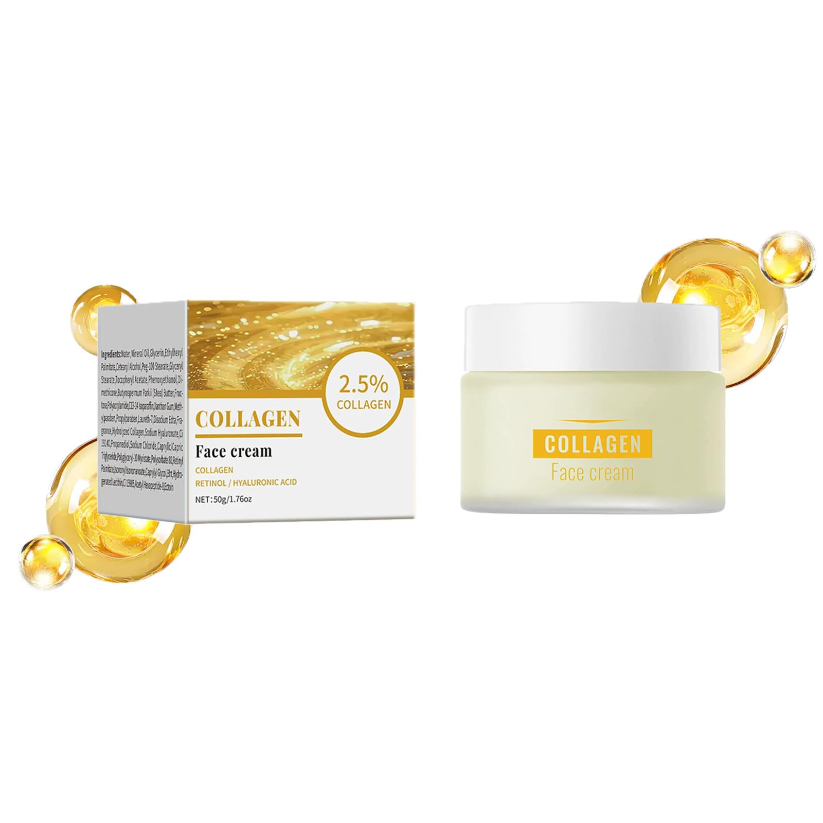 Collagen Face Cream – Deep Hydration Youthful Glow: Give your skin the nourishment it deserves with our Collagen Face Cream, specially formulated to replenish moisture and support a smoother, more supple complexion. Enriched with natural collagen, this luxurious cream helps improve skin elasticity, leaving your face feeling soft, plump, and revitalized. Collagen Face Cream's Key Benefits: ✓ Deep Hydration – Absorbs quickly to deliver long-lasting moisture, reducing dryness and flakiness. ✓ Supports Skin Elasticity – Helps maintain a firmer, more youthful appearance over time. ✓ Soothes Nourishes – Gentle formula perfect for daily use to keep skin comfortable and smooth. ✓ Lightweight Non-Greasy – Smooth texture that melts into the skin without clogging pores. How to Use: STEP 1: Wash face with water and apply proper amount to face. STEP 2: Push from the inside out, bottom up,gently massage. STEP 3: Use morning and evening, massage until absorbed. Type: Collagen Face Cream Net: 50 g 1.76 oz Shelf life: 3 years[Gentle Formula for Daily Use] Gentle yet effective, this collagen cream is designed to comfort dry or sensitive skin. Infused with moisturizing extracts, it helps reduce redness and discomfort while strengthening the skin's barrier. Whether your skin is stressed from environmental factors or needs extra TLC, this cream provides a soothing, protective layer to keep it balanced and resilient. [Lightweight Yet Luxuriously Nourishing] Unlike heavy creams that clog pores, this collagen moisturizer has a silky, fast-absorbing texture that feels without residue. It's perfect for all skin types, including combination or easily congested skin. The delicate, non-irritating formula ensures your skin stays hydrated, comfortable, and refreshed throughout the day or night. [Enhances Skin's Natural Radiance] By supporting your skin's moisture levels and collagen production, this face cream promotes a naturally radiant complexion. It revitalizes dull, tired-looking skin, restoring its healthy vibrancy. The non-greasy formula layers beautifully under makeup or can be used overnight for an intensive moisture boost, waking up to fresher, more luminous skin. [Boosts Skin Elasticity Reduces Fine Lines] Formulated with premium collagen, this cream helps improve skin's elasticity and firmness over time. Regular use visibly diminishes the appearance of fine lines and wrinkles, giving your skin a more youthful bounce. The rich, velvety texture absorbs quickly without greess, making it ideal for daily use to maintain a lifted, revitalized look. [Deep Hydration Intense Moisturization] This collagen face cream delivers deep, long-lasting hydration to plump and nourish your skin. Enriched with natural collagen and skin-loving ingredients, it helps restore moisture balance, leaving your complexion soft, smooth, and supple. Perfect for dry, dehydrated, or mature skin, it works to reduce tightness and flakiness while promoting a healthy, dewy glow.