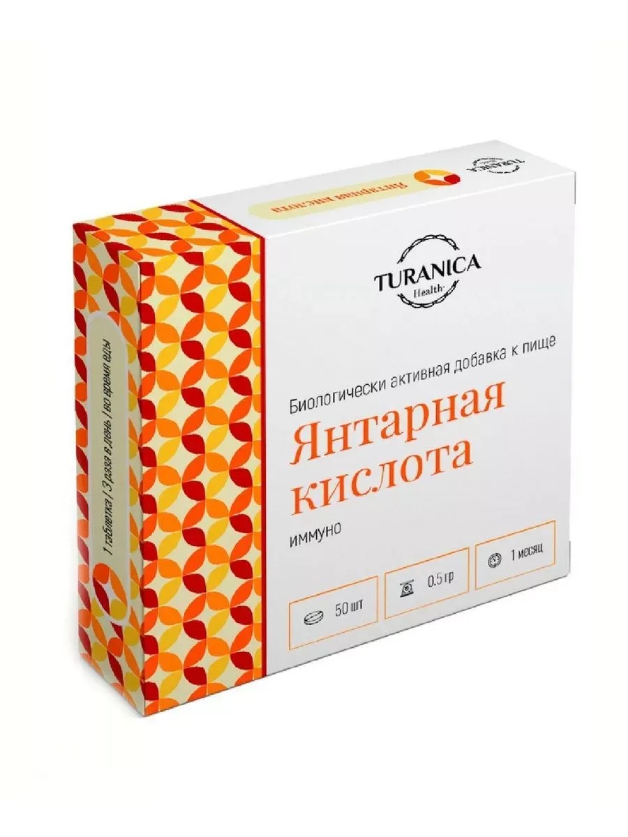 Таблетки Turanica янтарная кислота иммуно являются биологически активная добавкой к пище, которая способствует укреплению иммунитета организма. Они содержат 50 таблеток по 500 мг массой каждая, что обеспечивает достаточный запас на длительное время. Главным активным компонентом является янтарная кислота, которая является природным антиоксидантом и способствует борьбе с свободными радикалами, а также помогает снизить воспаление в организме. Рекомендуется принимать таблетки в качестве дополнения к основному рациону питания, чтобы укрепить свой иммунитет и повысить общий уровень здоровья.TURANICA ЯНТАРНАЯ КИСЛОТА ИММУНО - Биологически активная добавка (БАД) к пище- янтарная кислота - мощный антиоксидант, который замедляет процессы старения, ускоряет обменные процессы и поддерживает иммунитетСуточная доза (3 таблетки) содержит - Янтарной кислоты 300 мг.Вещество обладает сильными антиоксидантными свойствами, обезвреживает свободные радикалы, улучшает работу мозга, печени, сердца, укрепляет иммунитет, препятствует развитию злокачественных новообразований, тормозит воспалительные процессы, понижает сахар в крови, восстанавливает работу нервной системы, нейтрализует яды, способствует растворению камней в почках.РЕКОМЕНДАЦИИ ПО ПРИМЕНЕНИЮ:Взрослым по 1 таблетке 3 раза в день во время еды.Продолжительность приема: 1 месяц.