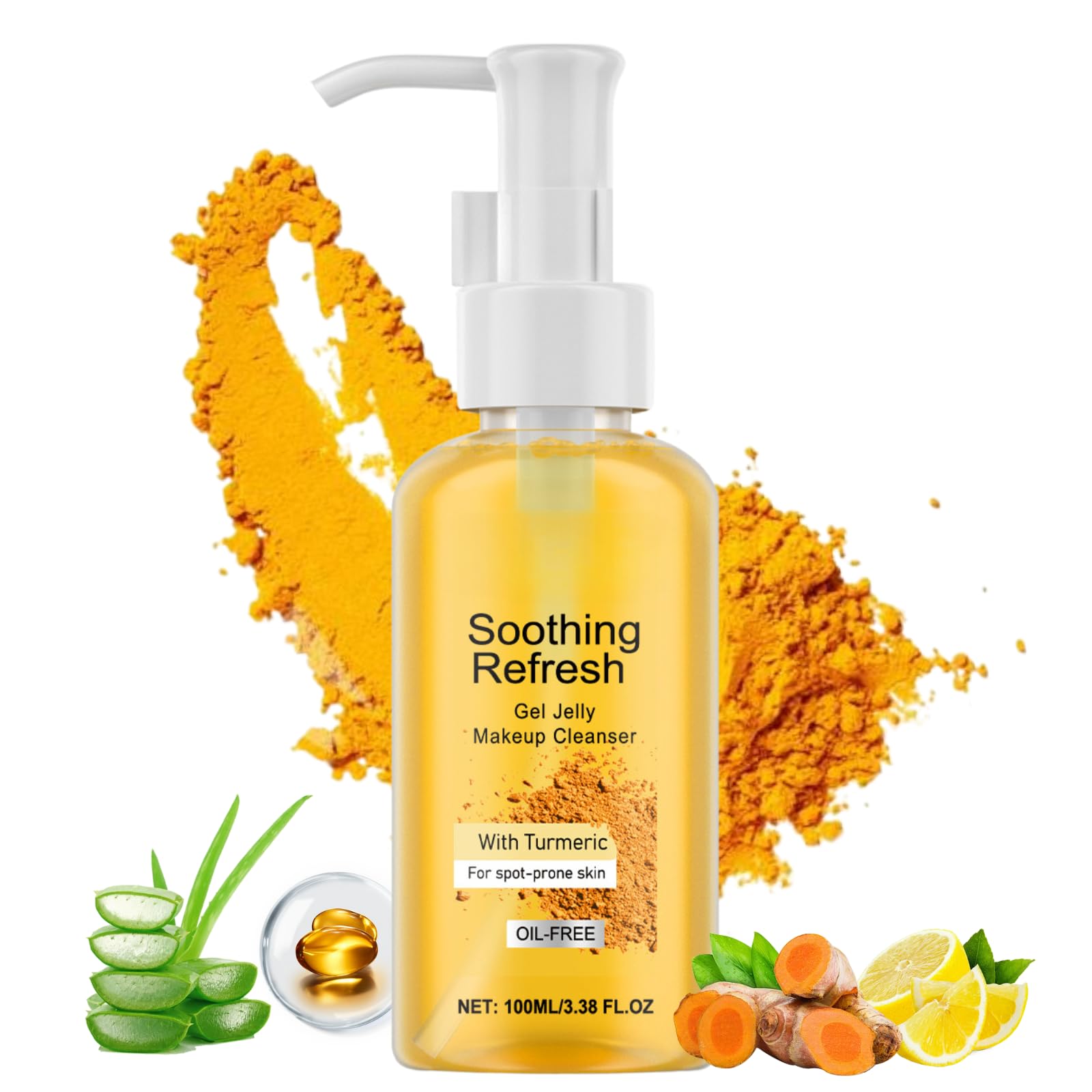 Turmeric Cleansing Makeup Remover Gel: 1.The Facial Cleanser Gentle Makeup Removal can quickly dissolve makeup and dirt, easily remove makeup, and ensure that the skin is completely clean without residue. 2.The turmeric makeup remover mildly cleanses the skin, leaving the skin feeling refreshed and not tight, forming a barrier to protect the skin. 3.Easy to apply and dissolve only a small amount is needed to achieve the ideal makeup removal effect, no need to rinse repeatedly, saving time and effort. Features: 1.Deeply clean the skin without any tightness. 2.Contain turmeric, lemon fruit extract, which can brighten dark skin and balance skin tone. 3.Clean the pores, remove facial makeup and dirt, deep clean and decontamination, purify the pores in the body, make the skin transparent and bright. 4.Mild moist texture for easy absorption, safe to use for a variety of skin types. Specification: Name: Turmeric Gel Jelly Makeup Remover Quantity:1PCS Net: 100ml /3.38 FL.OZ Shelf life: 3 years Skin Type: Suitable for all skin types Applicable people: men and women How to use: 1.Take an appropriate amount of this product and apply itevenly on the face. 2.Gently massage in circular motions until makeup is removed. 3.Finally wash it with clean water. Notes: 1.Avoid direct contact with eyes. Please rinse with water if eye contact happens. 2.For external use only. Avoid contact with eyes and inhalation. 3.The product should be stored away from direct lights. 4.Please keep this product out of reach of children. 5.Discontinue use if redness or irritation occurs.If irritation is excessive, consult your doctor immediately. SAFETY WARNING For external use only. Keep away from nakedfame or direct heat sources.?Suitable for all skin types? Our natural gel cleaner is formulated to remove pore-blocking debris for all skin types, including sensitive, aging,dry,oily, and combination skin.This turmeric mekeup remover makes the skin full and keep the skin elastic and moist. ?Transform Dull Skin?Our turmeric makeup remover gel reduces pigmentation from environmental damage, restores glow, and evens out skin tone for more radiant appearance,which is especially suitable for spot-prone skin. ?Long-lasting Moisturizing?The aloe leaf extract of our turmeric makeup cleanser gel is specially added to help moisturize the skin and will not make the face tense, make it feel more vigorous and clear. The Facial Cleanser Gel help maintain skin moisture balance. Leaving you with supple, hydrating skin all day. ?Completely Removes Residues?Use this smoothing gel cleanser to help clean the old dirt in the pores and refresh the skin with a clear feeling. Makeup remover gel can effectively remove facial makeup and dirt in a short period of time, without the need for prolonged massage. ?Clear & Refreshing?The Turmeric Cleansing Gel is clear and non-greasy, emulsify when exposed to water, gently remove facial makeup. The oily skin can be easily accepted by Hydrating Gel Jelly Makeup Remover. With a lightweight texture, the skin feels refreshed after use without any greasy residue.