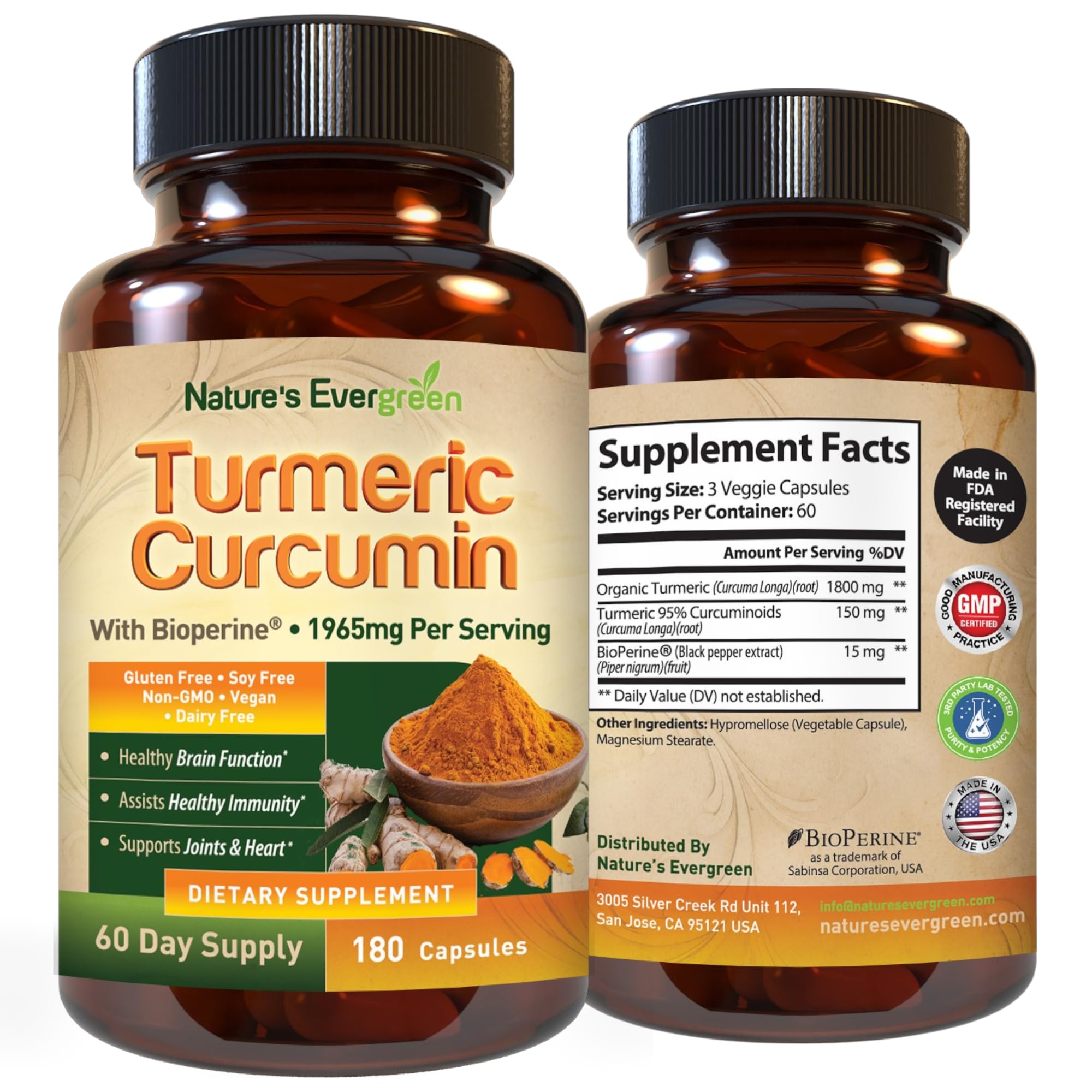 90-DAY MONEY-BACK GUARANTEE: We stand behind every product we make. For any reason, you're not completely satisfied within 90 days, simply reach out to us, and we'll do our best to resolve the issue. Try Nature's Evergreen products with 90-day risk-free guarantee!. PREMIUM QUALITY TRUSTED FORMULA: Proudly made in the USA, vegan, non-GMO, gluten free, sugar free and dairy free. This Turmeric Curcumin supplement is manufactered in GMP certified facilities in the United States, each batch is third party lab tested to ensure the highest standards of purity potency, and safe ingredients that you can use with confidence. ALL NATURAL BENIFITS: Packed with potent antioxidants, this Turmeric supplement helps combat oxidative stress while supporting heart and brain health. Regular use may aid in maintaining a healthy cardiovascular system, enhancing cognitive function, and promoting overall wellness. IMMUNE AND DIGESTIVE SUPPORT: Vegan Joint Support supplement is thoughtfully crafted with Organic Turmeric to help balance inflammation, support digestive health, and promote a healthy gut. It also strengthens immune defenses while featuring ingredients that are gentle on the stomach for most individuals. ULTRA HIGH PURITY ORGANIC TURMERIC: Our Turmeric Curcumin supplement is expertly crafted with a premium blend of organic turmeric root extract, standardized to 95 curcuminoids for superior potency. Enhanced with BioPerine black pepper extract, it ensures 2000 better absorption for optimal effectiveness. Each serving provides the full benefits of high-quality turmeric to support your overall health and well-being.