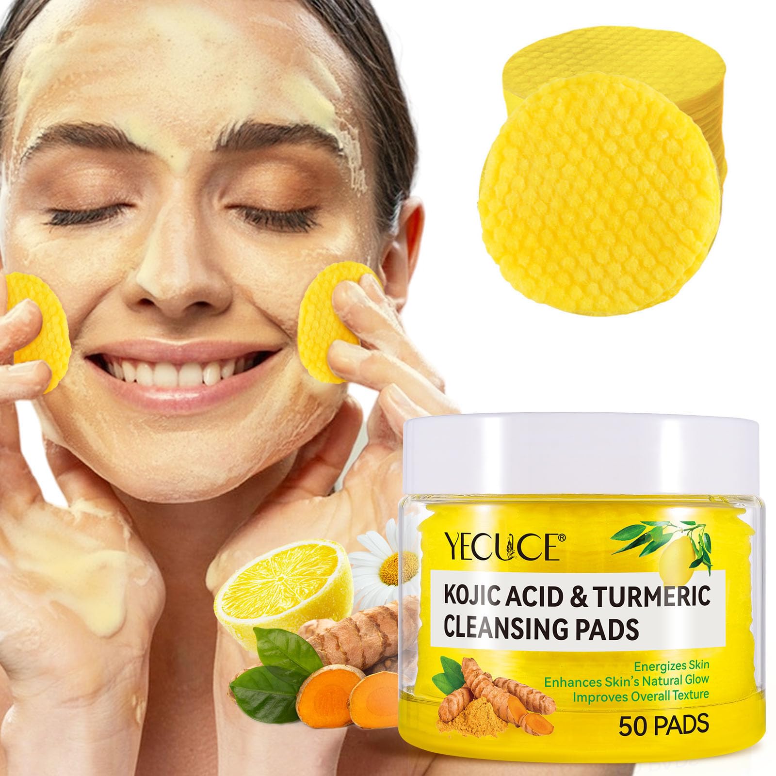 Kojic Acid and Turmeric Cleansing Pads - 50pcs/jar Turmeric Cleansing Pads, Turmeric Face Scrub Pads, For All Skin Type BENEFITS: ? Remove dead skin ? Deep clean pores ? Reduce dark spots or marks ? Balanced skin oil and water ? Promote a smoother, more vibrant skin tone ? Gentle and Safe for all skin types INGREDIENTS: Aqua, Turmeric, Turmeric Extract, Chamomile Hydrolat, Coco Glucoside, Vegetable Glycerin, Panthenol(B5), Lemon and Orange Peel, Kojic Acid (1%), Grapefruit Seed Extract Surfactant, Vitamin C, Natural Preservative Lactobacillus ferment (LSFMC). PACKAGE: 50 Pads Turmeric & Kojic Acid Cleansing Pads??HOW TO USE: To use these cleansing pads, soak a sponge in water until it swells, wring out excess water, and apply the cleansing pads directly to your face. Gently wash your face in circular motions for 1 to 2 minutes to achieve thorough cleansing. ??Convenient and Portable - Each leakproof jar contains 50 pads turmeric cleansing pads. Ideal for travel, these kojic acid pads are reusable and make it easy to maintain your skin care routine. ??Multi-Purpose Kojic Acid Pads - Our turmeric and kojic acid face pads are versatile. You can use them for various purpose, including cleansing, exfoliation, applying skincare products, makeup removal, applying facial masks, etc. ??Exfoliate and Smooth Your Skin - These turmeric exfoliating pads are enriched with turmeric, kojic acid, and vitamin C. The microfiber side of the double-sided mask removes dead skin cells and gently exfoliates for a smooth, fresh complexion while turmeric soothes and calms skin. ??Deep Pore Cleansing - Infused with gentle cleansers, our turmeric pads penetrate deep into pores to cleanse pores, removing dirt, oil and makeup without stripping away essential moisture, leaving your skin feeling refreshed and rejuvenated. ??Natural Turmeric Kojic Acid Cleansing Pads TK - Turmeric kojic acid pads carefully select natural ingredients such as turmeric, lemon, turmeric extract, kojic acid (1%), vitamin C, etc., formulated without harsh chemicals and safe for all skin types, including oily, dry, normal, acne-prone and combination skin type.