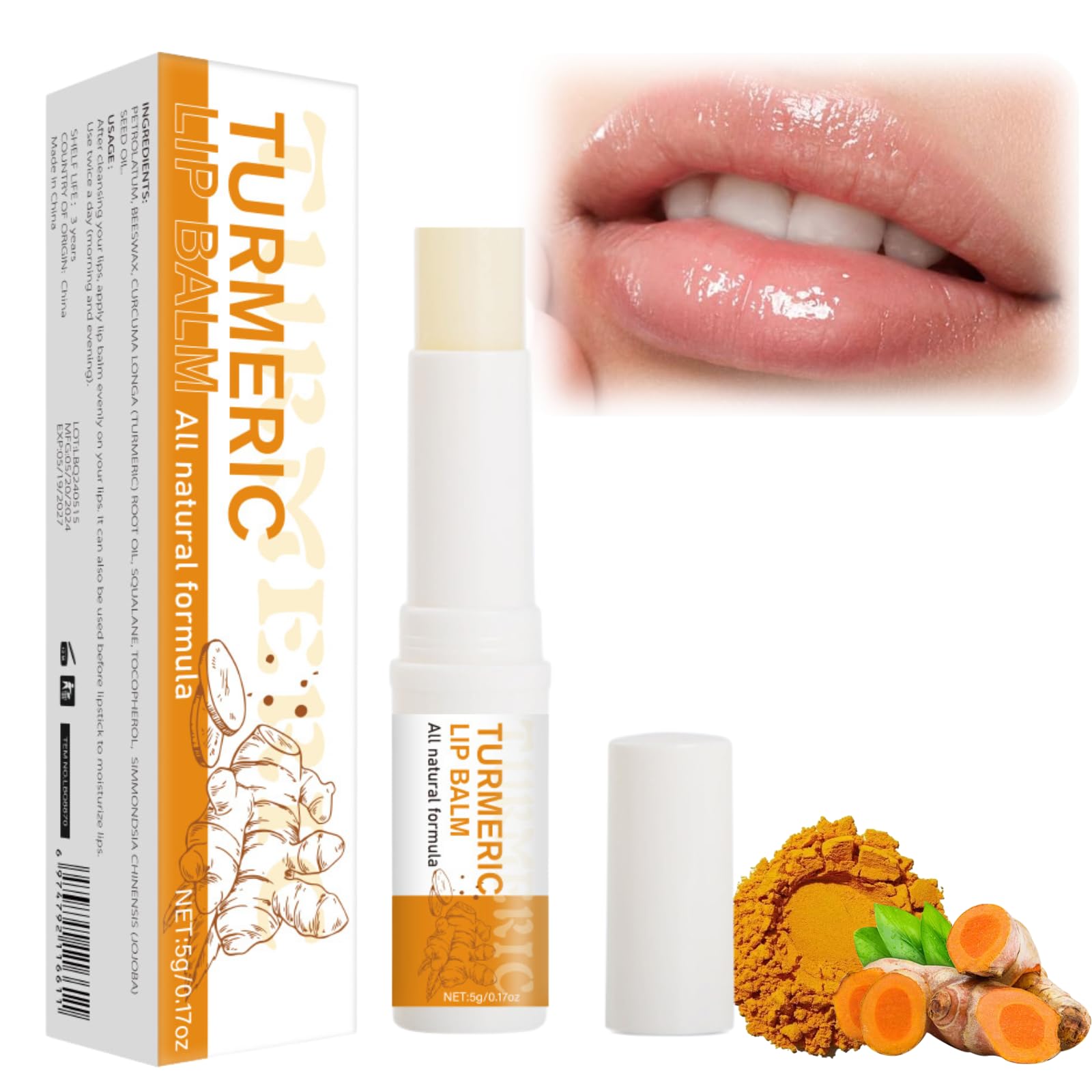 Are you worried about your wrinkled lips? Are you still suffering from blurry lip line effect your make-up? Do you want to find a suitable Hydrating Lip Balm for you? Just Say goodbye to your dry, peeling, cracked lips! Our Turmeric Lip Balm Stick is the only lip care you need! Features: 1.Suitable for wrinkled lips, thin lips with blurry lip line, rough and dull lips that look sick, dry lips, lips with deep lip lines, chapped lips. 2.Gentle skin-friendly, soften and remove the aging keratin of the lips, add rich nutritional moisturizing essence to the lips. 3.The Turmeric Lip Balm provide hydration and protection, lock moisture, repair cracked and damaged lips. 4.Helps improve chapped lips.Helps lighten discoloured lips.Reduces fine lines around the lips.Hydrates and moisturizes dry lips. How to use: 1.After cleaning your lips, apply Lip Care Cream evenly on your lips. 2.The turmeric lip moisturiser can be applied thickly or thinly. 3.Our beeswax lip balm can be used as lipstick, morning and night. 4.Combined with the organic ingredient of turmeric, it keeps lips moisturized. Package Includes: 1 * Turmeric Lip Balm Stick Notes: 1.Use 1 -2 times per days. 2.Product is for external use only. Recommended to use before sleeping time. 3. Do not stick it on damaged skin and if irritation occurs. SAFETY WARNING For external use only. Avoid contact with eyes. Keep away from naked flame or direct heat sources.?Easy to Carry?The turmeric lip lightening cream is small and delicate,chapped lips can be easily put into your make-up bag,school bag and pocket, to meet your lip care needs anytime, anywhere,whether you are going to school,work,party or travelling,the lip brightening for dark lips will help you easily moisturise your lips. ?Easy To Absorb & Not Greasy?The lip moisturiser has a smooth texture and is easy to use. You can dilute the lip line and bid farewell to pale lips! The Lip Care Cream is an ideal moisturizer for dry lips and the best choice for gifts in autumn and winter!. ?Multi-purpose Beeswax Lip Balm?During the day, you can apply the turmeric lip repair balm before applying make-up as a moisturiser before lipstick. You can also use it before going to bed and apply a thick lip balm at night to enhance your lips and keep them hydrated. ?Effectively Smooths Lips?Our lip plumping balm helps to soften aging lips and lip balm for dry lips easily removes dead skin tissue caused by dryness and dehydration while the lip balm can repair reducing dullness.The turmeric lip stick form a moisturizing film on the lips, block the active ingredients, and restore the fresh color of the lips. ?Moisturize & Soothe?The turmeric lip balm stick are moisturizing and soothing and can be used all year round to protect against dried out, sore, chapped lips caused by the change of seasons.The hydrating lip balm effectively nourish dry lips, relieve tingling lip infections and protect the lip skin, keep your lips hydrated at all times.
