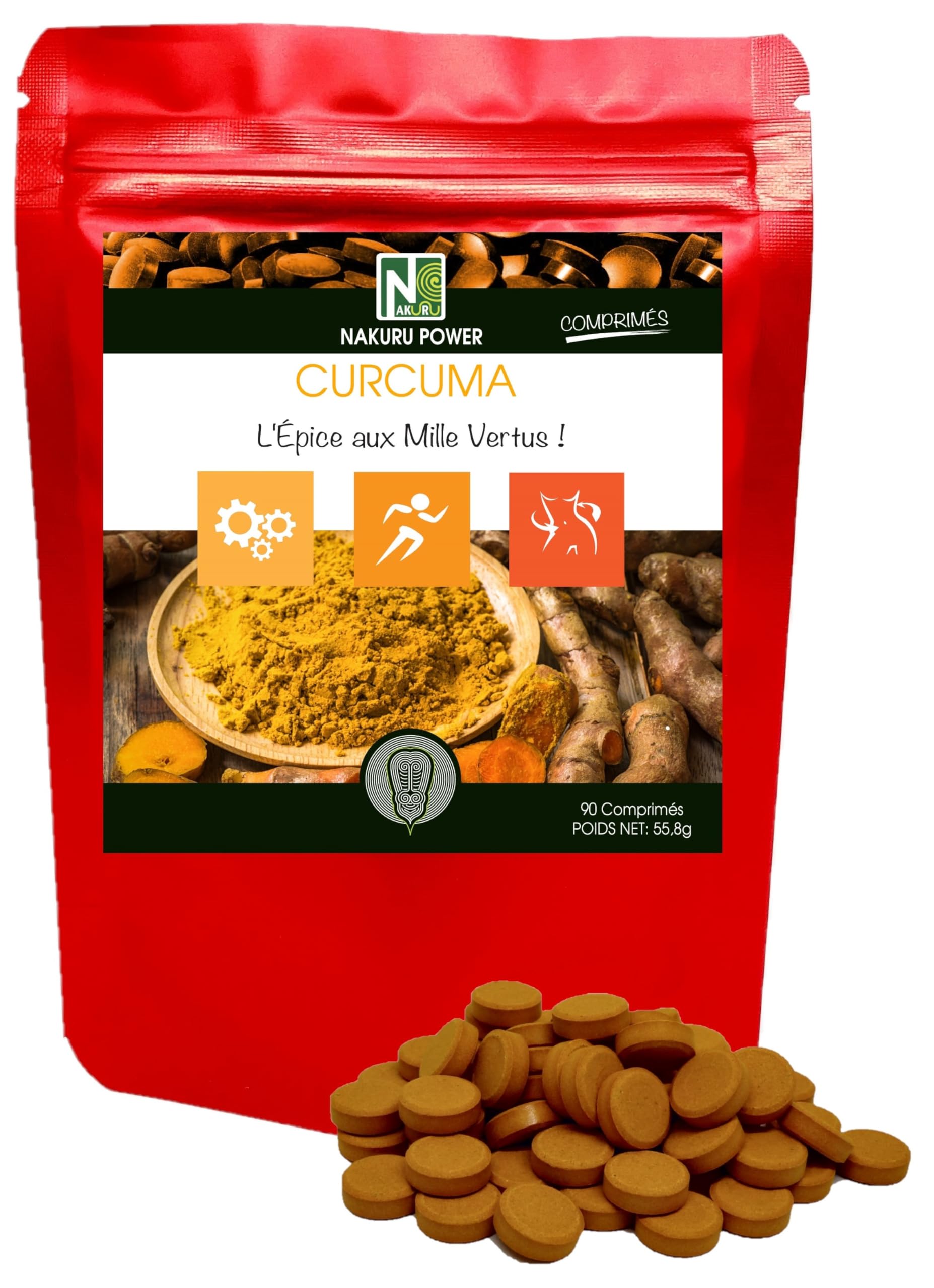 Turmeric | NAKURU Power | Cold Dried and Compressed Powder | Analyzed and Packaged in France | The Spice of a Thousand Virtues! (90 Tablets of 620mg/Net Weight: 56g/Bronze)