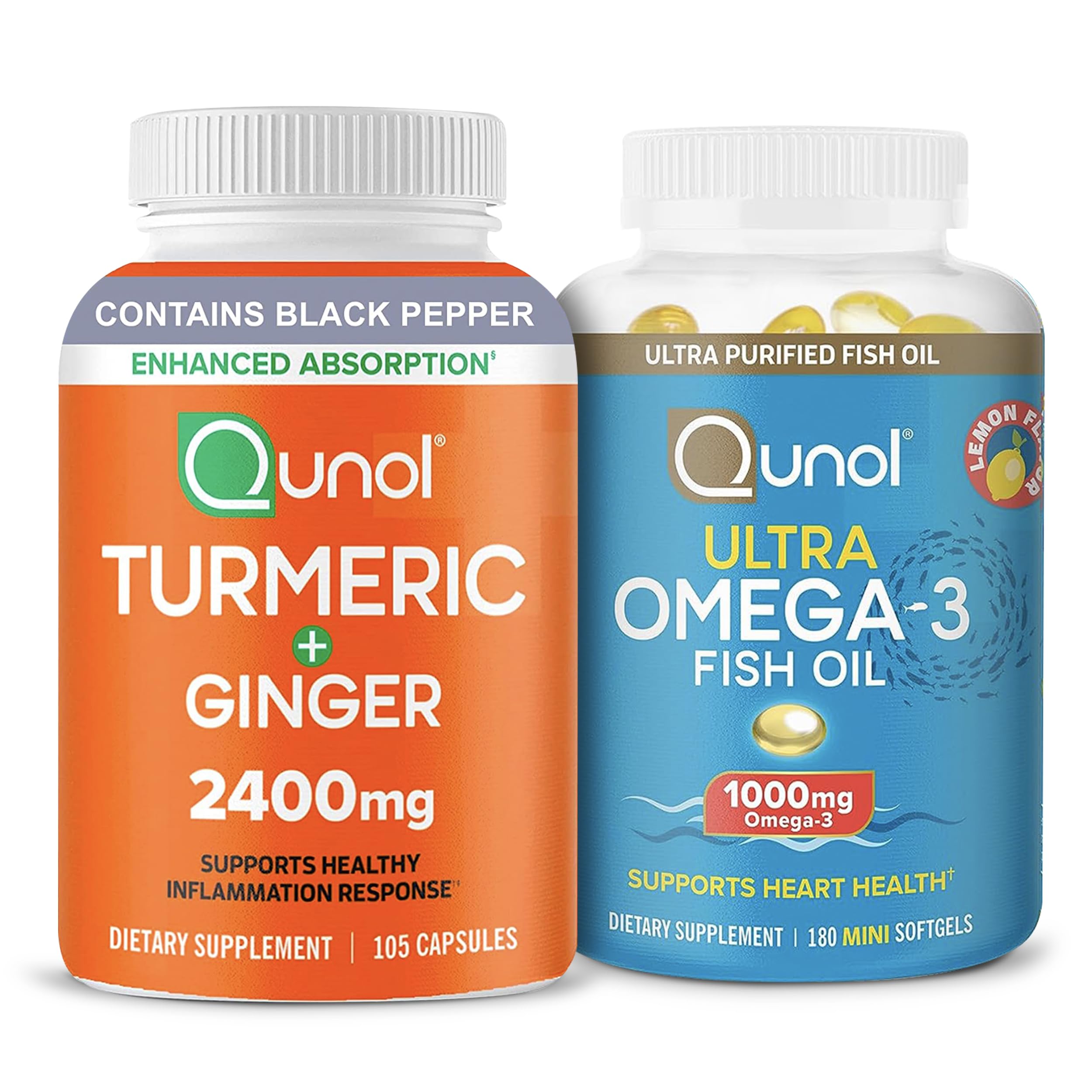 MAY ALSO HELP WITH: Supporting brain and overall health. SUPPORTS HEALTHY INFLAMMATION RESPONSE AND JOINT HEALTH: Get moving. Qunol Turmeric supports healthy inflammation response associated with physical overexertion and can also help promote joint comfort SUPPORTS HEALTHY INFLAMMATION RESPONSE AND JOINT HEALTH: Get moving. Qunol Turmeric supports healthy inflammation response associated with physical overexertion and can also help promote joint comfort. LEMON FLAVOR: Help control fishy aftertaste. GINGER ROOT: A traditional herb used for centuries packed with soothing botanicals. AN EXCELLENT WAY TO SUPPLEMENT ESSENTIAL FATTY ACIDS: Omega-3s are considered essential because the body does not produce it and most people do not get the recommended daily levels of Omega-3 from their diets alone. TURMERIC CURCUMIN: Has a long tradition of helping soothe tired, overworked joints. Supports healthy inflammation response associated with physical overexertion. ULTRA PURIFIED FISH OIL: Made with fresh wild-caught small fish and ultra purified fish oil. BLACK PEPPER EXTRACT: Qunol Turmeric plus Ginger 2400mg capsules contain black pepper extract that enhances absorption and increases bioavailability. SUPPORT HEART HEALTH: Qunol Omega-3 softgels provide 1000 mg of Omega-3 fatty acids per serving including 645mg EPA and 310mg DHA. ENHANCED ABSORPTION FORMULA: Qunol Turmeric capsules contain 2250mg of 95 curcuminoids, 150mg organic ginger root powder, and 15mg black pepper extract to enhance absorption. Other formulations may have only 5 curcuminoids.