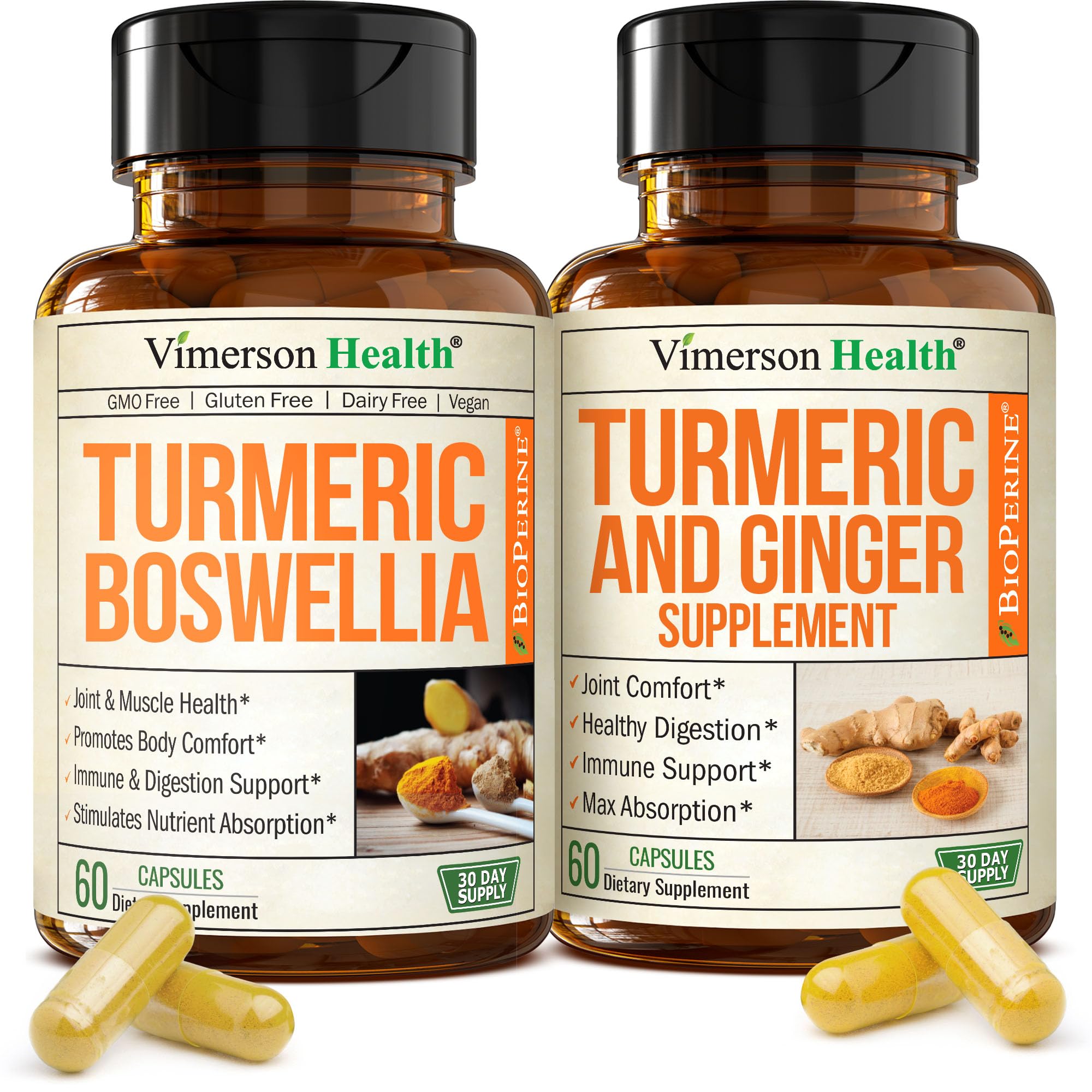 Unlock Natural Joint Digestive Support Our premium Turmeric Supplement Bundle is expertly crafted for adults 35 , active individuals, and health-conscious seniors. It combines two complementary formulas—Turmeric with 65 Boswellia Extract and Turmeric with Ginger Root—to support joint health, mobility, digestion, and overall vitality. Key Benefits: Joint Support Supplement: Reduces joint discomfort, promotes flexibility, and enhances post-workout recovery for activities like yoga, running, and weightlifting. Curcumin Supplements for Gut Immune Health: Balances inflammation, strengthens digestion, supports immune defenses. Enhanced Absorption: BioPerine boosts curcumin bioavailability for faster, longer-lasting results. Antioxidant Protection: Tumeric Combats oxidative stress, promotes brain function, supports healthy aging. How to Use: Take 2 capsules of Turmeric Boswellia daily to support joint health, flexibility, and mobility. Take 2 capsules of Turmeric Ginger daily to promote digestive comfort, inflammation balance, and daily vitality. Capsules can be taken together or separately with meals. Use consistently for best results. Most users experience noticeable benefits within 30–60 days. Reclaim mobility maintain an active lifestyle naturally with this trusted turmeric supplement, designed to deliver targeted support for joint comfort, digestion, overall health. Join thousands who rely on this turmeric curcumin supplement to stay active, healthy energized.ENJOY YOUR FAVORITE ACTIVITIES AGAIN - Whether gardening, hiking, practicing yoga, or simply staying active, this tumeric-based bundle supports joint mobility and overall well-being. Incorporate it into your daily routine to stay comfortable, flexible, and free from occasional joint discomfort. . SUPPORT JOINT HEALTH NATURALLY - A safe, clean turmeric bundle designed to promote flexibility, mobility, and joint comfort. Ideal for busy caregivers, health-conscious seniors, and active individuals seeking daily wellness support from a trustworthy, clean supplement. . PREMIUM TURMERIC CURCUMIN SUPPLEMENTS YOU CAN TRUST - Made in the USA with global ingredients in a cGMP-certified NSF-certified facility for safety efficacy. Third-party tested for purity and potency. Non-GMO, Vegan, Gluten-Free, Dairy-Free, Sugar-Free, and Soy-Free. . HIGH-POTENCY, SCIENCE-BACKED FORMULA - These turmeric pills deliver a standardized blend of Turmeric Curcumin 95 , Boswellia Extract (65 Boswellic Acid), Ginger, and BioPerine for enhanced absorption. A reliable formula designed for consistent, effective results you can feel. . JOINT HEALTH - Turmeric Curcumin 95 , Boswellia Extract, Ginger Root, and BioPerine work together to support natural relief from occasional joint discomfort and promote flexibility. Take daily as part of your wellness routine to stay active. . INFLAMMATION BALANCE - Combining the synergistic power of Turmeric Curcumin, Boswellia Extract, and Ginger Root, this bundle supports a healthy inflammatory response and helps ease occasional joint discomfort and a calm digestive system. A natural and effective choice to support flexibility, mobility, and daily comfort - without harsh additives. . DIGESTIVE GUT HEALTH – This dual-formula bundle combines Boswellia Extract, Ginger Root, and Turmeric Curcumin to promote digestive comfort and support a healthy gut microbiome. Perfect for use after meals. Use consistently to experience the full benefits. .