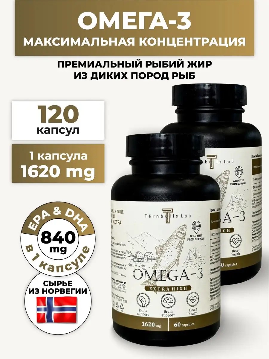 В комплекте - 2 банки Омега Экстра по 60 капсул. Омега 3 Экстра высокой концентрации - это витаминный комплекс в капсулах без вкуса и запаха премиального качества из рыбного жира Норвежского производителя. Omega 3 Extra High от Tёrnbulls Lab содержит 900 мг полезных веществ в 1 капсуле - полиненасыщенные жирные кислоты (ПНЖК 900 мг, в том числе ЭПК - 600 мг, ДГК - 240 мг). Омега-3 из дикой рыбы отлично усваивается, а значит эффективнее других Омег из обычной рыбы . Всего 1 удобная капсула Omega 3 в день обеспечивает вашу минимальную потребность в омега-3 жирных кислотах. Вы можете увеличить суточный прием в зависимости от вашей комплекции, возраста и уровня нагрузки. Омега - это одна из самых базовых добавок для здорового и активного образа жизни в любом возрасте. Омега-3 fish oil Экстра премиум из дикой морской рыбы прекрасно усваивается, поэтому идеально подходит детям c 3-х лет, подросткам, взрослым мужчинам и женщинам 18+ до 120 лет, спортсменам. Витамины Омега3 укрепляют женское, мужское, детское здоровье подростков, парней и девушек. Питает суставы, связки, кости, кожу лица и тела, ногти, мозг, зубы, глаза, поддерживает при депрессии, работает против выпадения и ломкости, для густоты волос. Поддержит здоровье сердца и сосудов при сердечно-сосудистых заболеваниях. Повышение иммунитета в осенний, зимний и весенний период. Рыбий жир при похудении и подавлении аппетита поможет в росте энергии днем, сработает как успокоительное вечером и ночью без принятия снотворного при бессоннице для сна, повысит вероятность на понижение давления и поможет исключить снотворное. Omega-3 идеальный подарок всем членам семьи. Морская океаническая Omega3 совместима с витаминами группы б b 6 9, d3 д3, коллагеном, магнием б6 в6, минералами: кальций цинк железо хром, пищевыми добавками, спортивными мультивитаминами. БАД Омега 3 имеет форму выпуска в мягких желатиновых капсул, удобна в применении.