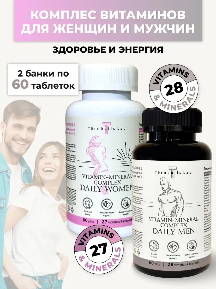 Tёrnbulls Lab's women's and men's vitamin complexes are the best choice for maintaining the health of the whole family. This multivitamin complex offers the perfect balance of essential vitamins and minerals for daily support of both men and women. Developed with the specific needs of women and men in mind for a truly active lifestyle amidst the stress of everyday life, these women's vitamins contain key components necessary for women's health and well-being. This comprehensive dietary supplement for women strengthens the immune system, increases energy and vitality, improves brain and nervous system function, and reduces the incidence of illness. Each tablet contains all the necessary micronutrients and multivitamins to improve health, overall well-being, enhance mental and physical performance, and boost immunity. Multivitamins for men address all the basic needs of the male body and health. Vitamins are essential for the proper functioning of the body. Each plays a role and regulates metabolic processes. Men's vitamins and minerals will be beneficial for both athletes and those simply striving to lead a healthy lifestyle. Take 1 tablet daily for one month. See the photo for the full composition.