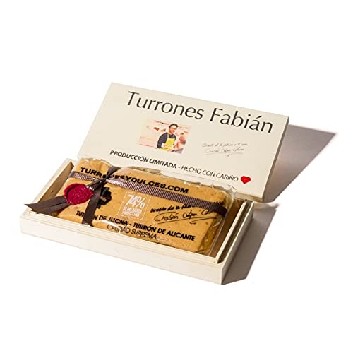 Ingredients: Roasted marcone almonds (74 ), pure honey harvested in Spain (15 ), sugar, and egg white. Produced in a factory that also processes other shelled fruits. Nutritional Information: Jijona Turrón Superior Quality Improved: Average values per 100g of product: Energy 2349 kJ (565 kcal), Total Fat 38g, Saturates 2.9g, Carbohydrate 33g (of which fiber 32g), Fiber 7.2g, Protein 19g, Salt 0.04gJijona turrón (74 ) is presented in a beautiful 300g wooden box. For this turrón, we use Marcona almonds (the highest quality), which give it its characteristic flavor, along with 15 pure honey from bees harvested in Spain to give this product its superior quality. At turronesydulces.com, we have undoubtedly created one of the best turrón in the world. For this exclusive edition, we have improved the recipe by adding more almonds (74 ) to enhance the flavor of this extraordinary product.Ingrédients : amande marcone grillée (74 ), miel d'abeille pur récolté en Espagne (15 ), sucre et albumine d'œuf. Élaboré dans une usine qui utilise d'autres fruits à coquille. Informations nutritionnelles : turron de Jijona Qualité Suprême améliorée : valeurs moyennes pour 100 g de produit Valeur énergétique 2349 kJ (565 kcal) Graisse totale 38 g AC. Graisses saturées 2,9 g Hydrates de carbone 33 g dont pulcars 32 g Fibre alimentaire 7,2 g Protéines 19 g Sel 0,04 gLe turron de Jijona (74 ) est présenté dans une jolie boîte en bois de 300g. Pour ce turron, nous utilisons l'amande Marcona (la meilleure qualité) qui donne cette saveur caractéristique au turron en accompagnant 15 de miel pur d'Abeille récolté en Espagne pour donner à ce produit une qualité suprême. Chez turronesydulces.com nous avons obtenu sans aucun doute l'un des meilleurs tourillons du monde. Pour cette édition exclusive, nous avons amélioré la recette en ajoutant plus d'amande (74 ) pour donner plus de goût à ce produit extraordinaire.Turron Jijona Gourmet 74 dans une boîte en bois couleur - Turronesydulces.com - 300 g.