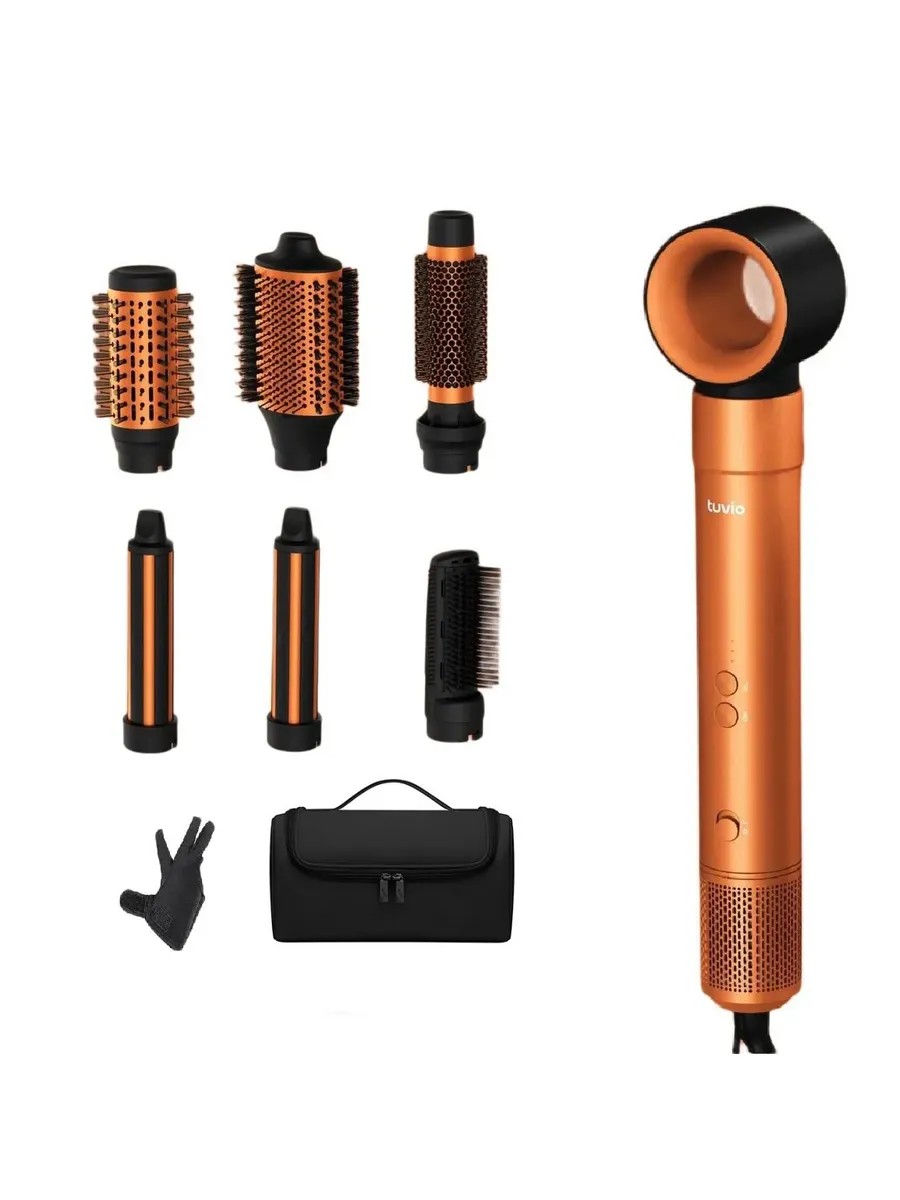 Package Contents 1414+: 1 x Tuvio HBI1414 orange hair dryer, 7 x attachments (left and right 35 mm cylindrical styling attachments, 33 mm round attachment, 50 mm round attachment, 70 mm oval attachment, hair dryer attachment, comb attachment), 1 x storage organizer (color is randomly determined depending on the seller's stock balance), 1 x thermal glove, instructions.