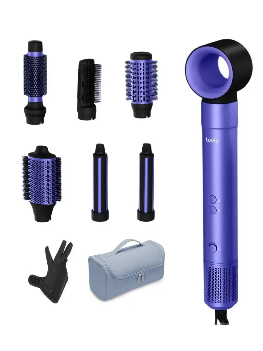 Комплектация 1415+: 1шт фен Tuvio HBI1415 фиолетовый, 7шт насадок (левая и правая цилиндрическая насадки для стайлинга 35 мм, круглая насадка 33 мм, круглая насадка 50 мм, овальная насадка 70 мм, насадка-фен для сушки, насадка-расческа), 1шт органайзер для хранения цвет синий, 1шт термоперчатка, инструкция.