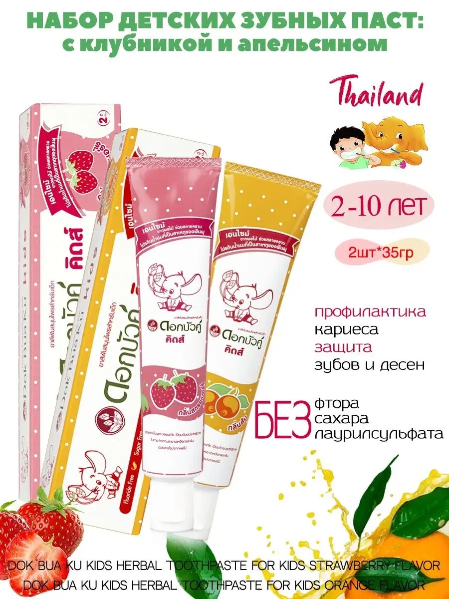 Thai children's toothpastes from the Twin Lotus brand (Twin Lotus) Dok Bua Ku are specially designed for the sensitive enamel of baby teeth, do not contain fluoride, lauryl sulfate and sugar, gently but effectively clean teeth, gums and the oral cavity from food debris, berry plaque or food colorings, prevents the development of caries. Herbal ingredients reduce the growth of bacteria in the mouth, give fresh breath. Natural components do not harm the child's body if accidentally swallowed. Benefits: strengthens tooth enamel; restores the natural whiteness of teeth; reduces the sensitivity of teeth and gums; comprehensive care of the entire oral cavity; delicately whitens; protection from caries; fluoride-free. Main components: - Orange and strawberry extracts are rich in vitamin C, an essential substance for the normal functioning of dental bone tissue. Replenishing vitamin C deficiency is the key to treating and preventing bleeding gums. It also freshens the mouth and breath, has a gentle whitening effect. - Intensively destroys plaque, improves the color of the enamel, minimizes the number of bacteria in the oral cavity, protects teeth and gums from diseases. Calcium strengthens tooth enamel, and this is an excellent prevention of caries. - Papain, or papaya enzyme, maintains the health of teeth and the oral cavity, suppressing the formation of plaque and the development of caries. It also prevents the growth of bacteria that cause plaque. - Silicon dioxide is a natural abrasive that helps thoroughly clean children's teeth from plaque, food debris, and any other contaminants. - Calcium lactate is a calcium salt of lactic acid, responsible for replenishing calcium deficiency during the period of teeth growth. - Glycyrrhizic acid is a component obtained from licorice root extract. Reduces swelling and protects against periodontal diseases. Directions for use: Use twice a day and after each meal. For children aged 2 to 10 years.