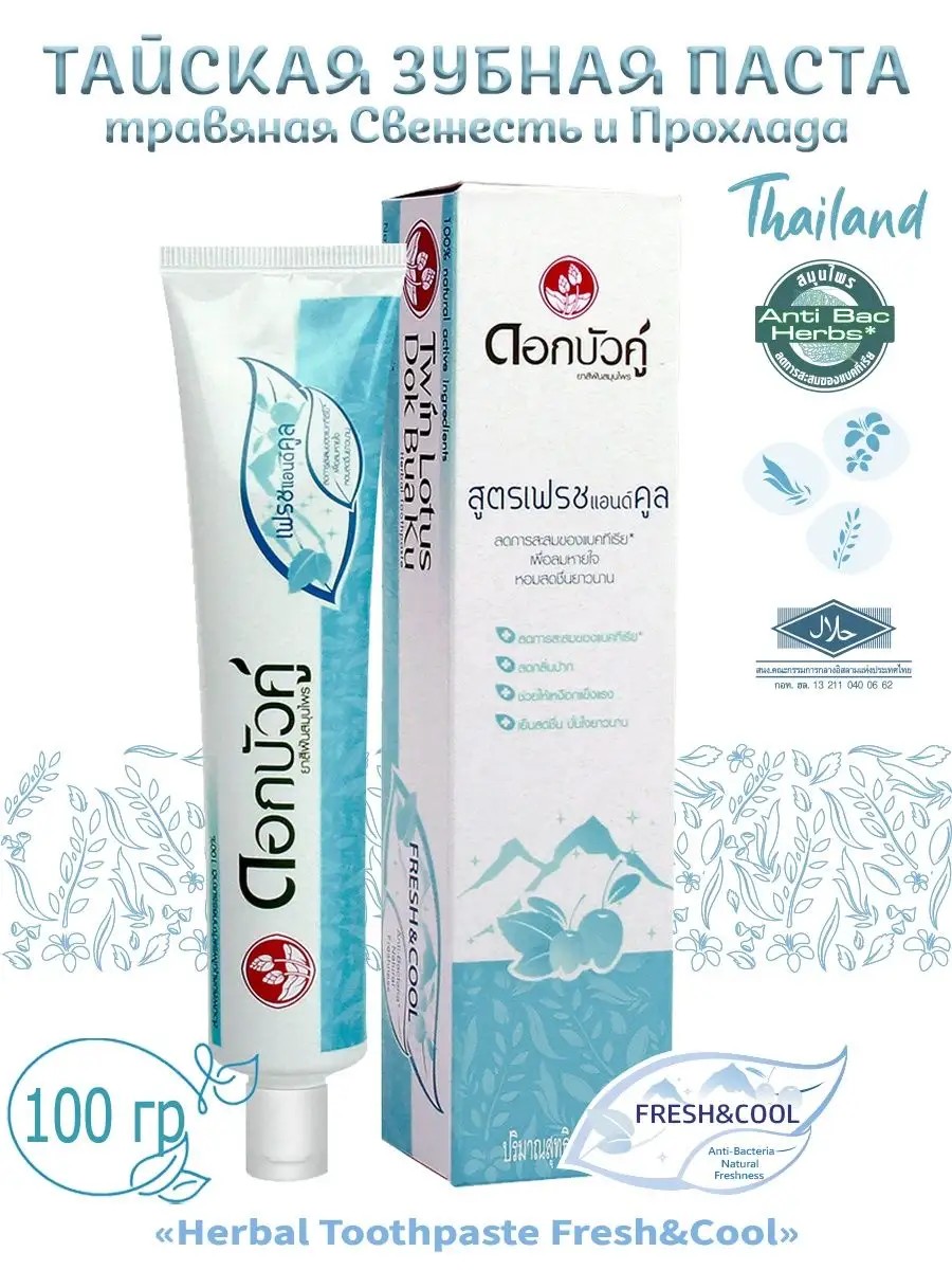 Тайская травяная зубная паста Twin Lotus (Твин Лотус) Dok Bua Ku "Свежесть и Прохлада" 100гр - традиционная Тайская паста, уникальная формула которой заботится о полости рта и зубах. Содержит 10 растительных ингредиентов, бережно ухаживает за зубами и деснами, подходит для ухода за чувствительными зубами, защищает от пятен, бактерий, неприятного запаха, удаляет налет от чая, кофе. Имеет темно-серый цвет. Преимущества: обладает общепрофилактическим действием; восстанавливает естественную белизну зубов; снимает налет от чая, кофе; при регулярном использовании удаляет зубной камень; не содержит фтор; обладает освежающим эффектом.