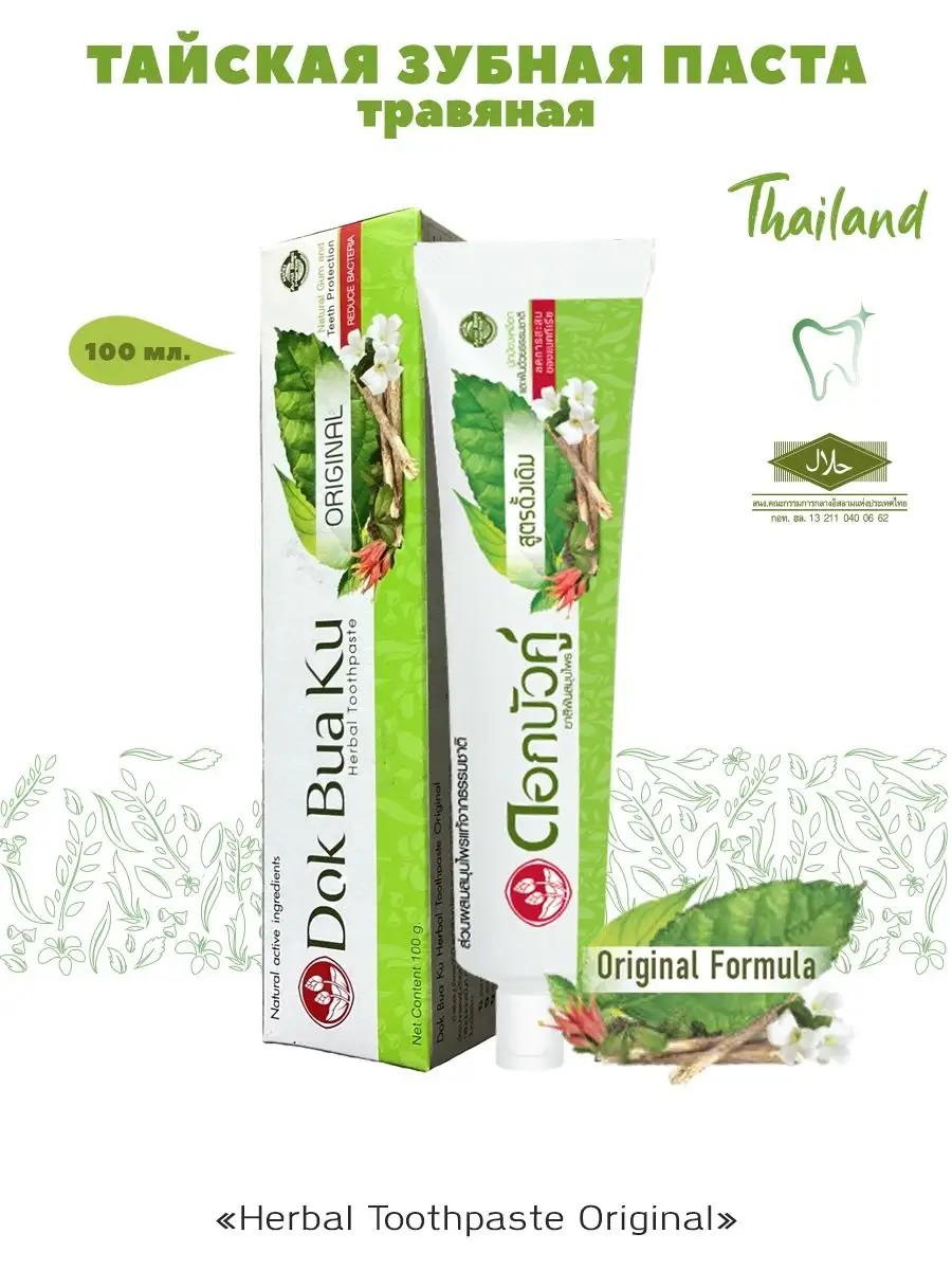 Thai herbal toothpaste Dok Bua Ku / Twin Lotus (Twin Lotus) Original - contains natural ingredients that can not only thoroughly clean and disinfect the oral cavity, but also solve comprehensive problems of gums and teeth. Herbal paste has a strong antibacterial, anti-inflammatory and antimicrobial effect. It has a dark brown color due to the fact that the herbs included in its composition have not been bleached, which means they have retained all their beneficial properties.