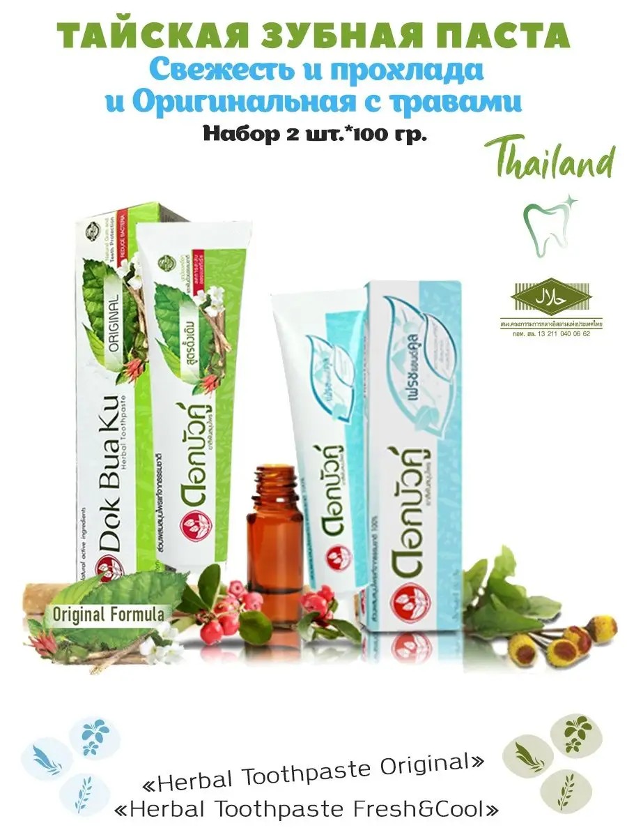 A set of Thai herbal whitening toothpastes from the Dok Bua Ku / Twin Lotus brand: Thai Toothpaste "Original Herbal Toothpaste" 100g + Toothpaste "Freshness and Coolness With Herbs" 100g. Contains natural ingredients that can not only thoroughly clean and disinfect the oral cavity, but also solve problems of gums and teeth in a comprehensive manner.