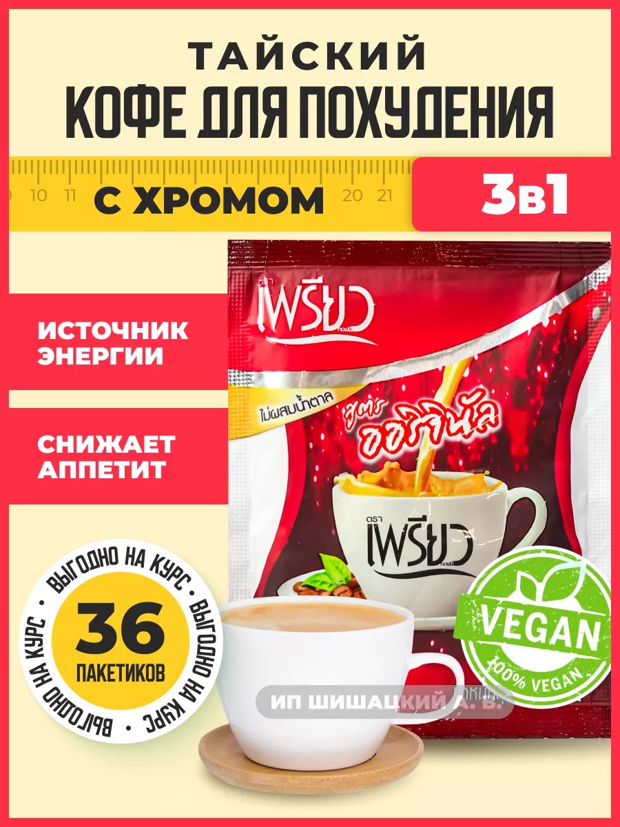 Тайский кофе для похудения – это уникальный растворимый кофе, который содержит все необходимое в одном пакетике. В этом подарочном наборе вы найдете 36 пакетиков азиатского кофе, которые помогут вам не только насладиться натуральным и вкусным напитком, но и поддержать свою фигуру. Этот кофе из Таиланда изготовлен по специальной 3 в 1 технологии, что делает его еще более удобным и простым в использовании. Благодаря своему низкокалорийному составу, кофе помогает активизировать обмен веществ и способствует сжиганию жира. Он отличный выбор для тех, кто стремится снизить лишний вес и достичь желаемых результатов. И самое привлекательное – этот кофе не только помогает в похудении, но также полноценно заменяет капучино, благодаря своему интенсивному и насыщенному вкусу. Главная особенность данного продукта – это содержание в составе микроэлемента хрома, который является важной составной частью углеводного обмена и контролирует уровень сахара в крови. Хром пиколинат - легкоусвояемая форма (хром хелат). Поэтому особенно популярен среди людей, страдающих диабетом, инсулиновой резистентностью . В каждом пакетике тайского кофе для похудения скрыта сила природных составляющих. Ведь в составе этого жиросжигающего кофе вы найдете натуральные ингредиенты, способствующие активации обмена веществ и детоксификации организма. Если вы стремитесь не только похудеть, но и улучшить свое самочувствие, то этот кофе с хромом совершенно идеален именно для вас. Вы можете насладиться им как горячим напитком, так и приготовить прохладный ледяной коктейль. Он не только станет вашим верным спутником на пути к идеальной фигуре, но и подарит вам истинное наслаждение от каждой чашечки. Способ применения: пакетик высыпать в кружку и залить горячей водой (120-200 мл), затем хорошо перемешать. Употреблять напиток в первой половине дня, за 30 минут до приёма пищи. Помните, что контроль аппетита и похудение только в ваших руках!