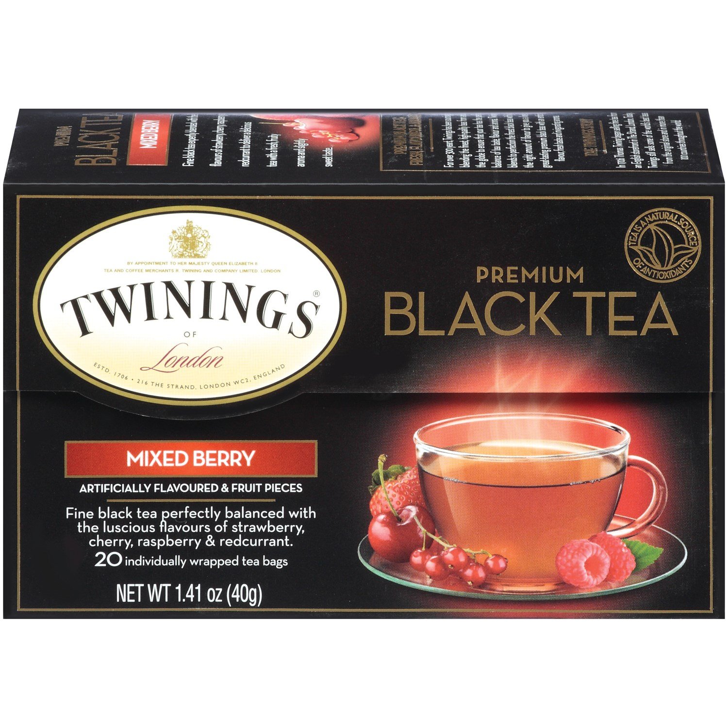 Fine black tea perfectly balanced with the luscious flavours of strawberry, cherry, raspberry redcurrant. Artificially flavoured fruit pieces. Tea is a natural source of antioxidants. Individually wrapped tea bags. By appointment to her majesty Queen Elizabeth II. Estd. 1706. Fine black tea expertly blended with the luscious flavours of strawberry, cherry, raspberry and redcurrant to deliver a delicious tea with a fresh, fruity aroma and slightly sweet taste. Premium black teas. Fresh, flavourful aromatic. For over 300 years, Twinings has been sourcing and blending the finest, high-quality teas from around the globe to ensure that your tea has the perfect balance of tea taste, flavour and aroma. Twinings blends to perfection the finest black teas with just the right amount of flavour to give you a line of great-tasting premium black teas with an enticing flavour, fresh taste and invigorating aroma. The Twinings Story: In 1706 Thomas Twining began selling fine tea from an English storefront in The Strand, London. Today, Twinings still sells some of the worlds best teas from the original store and in more than 100 countries throughout the world. Working for a responsible tea industry. Premium Blacks: Fine black teas with just the right amount of flavour. 20. Unit of Measure: BG. Case Pack Size: 6Case Pack Size: 6. Unit of Measure: BG. 20.
