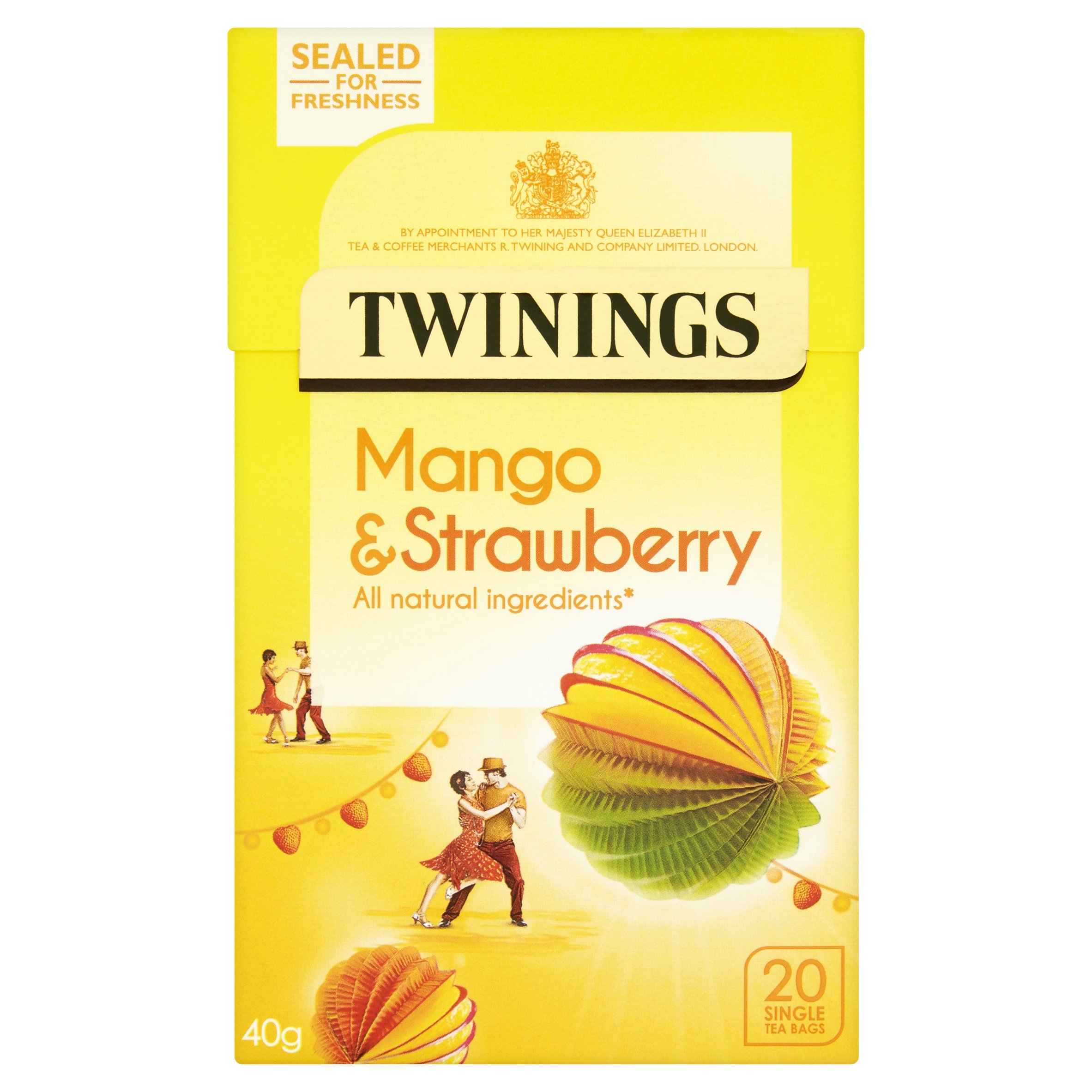 A mango and strawberry flavored infusion. Naturally caffeine-free with all-natural ingredients. All our herbs are gently steamed the process is gentle to protect their delicate flavor. Taste the best of all worlds. Sun-ripened tropical mangoes with their lush, silky flavor meet the sweet aroma of ripe strawberries growing in an English summer garden. It's like enjoying afternoon tea on an exotic Caribbean island. A touch of real orange peel and orange leaves adds a refreshing note to this rich and satisfying infusion. Made with natural ingredients—nothing more, nothing less. Naturally caffeine-free with no added sugar, enjoy it any time of day. Fancy cooling down? Let this infusion chill before adding ice and perhaps a slice of lime. If you like that, why not try something a little different? Mango and cinnamon hint at just the right warm and spicy note. INGREDIENTS Hibiscus, orange leaves (16 ), natural strawberry flavoring with other natural flavorings (10 ), natural flavorings (10 ), orange peel (7 ), rosehip, licorice root . All our herbs are gently steamed the process is gentle to protect their delicate flavor. INSTRUCTIONS Preparation: 1 tea bag per cup, pour boiling water over the bag, and let it steep for 3-5 minutes. SAFETY WARNING Contains barley. Not suitable for children. See moreTwinings - Mango Strawberry - Lot de 20 sachets de thé - 40 gDESCRIPTION DU PRODUIT DESCRIPTION DU PRODUIT Une infusion aromatisée à la mangue et à la fraise Naturellement sans caféine avec tous les ingrédients naturels Toutes nos herbes sont cuites à la vapeur doucement, le processus est doux pour protéger leur goût délicat. Goûtez le meilleur de tous les mondes. Les mangues tropicales mûries au soleil avec leur saveur luxuriante et soyeuse rencontre l'arôme sucré des fraises mûres poussant dans un jardin d'été anglais. C'est comme savourer le thé de l'après-midi sur une île exotique des Caraïbes. Une touche de véritable écorce d'orange et de feuilles d'orange ajoutent une touche rafraîchissante à cette infusion riche et satisfaisante. Fabriqué avec des ingrédients naturels - rien de plus, rien de moins. Naturellement sans caféine sans sucre ajouté, profitez à tout moment de la journée. Envie de vous refroidir ? Laisser refroidir cette infusion avant d'ajouter de la glace et peut-être une tranche de citron vert. Si tu aimes ça, pourquoi ne pas essayer quelque chose d'un peu différent ? La mangue et la cannelle font allusion à la bonne note chaude et épicée. INGRÉDIENTS Hibiscus, feuilles d'oranger (16 ), arôme naturel de fraise avec d'autres arômes naturels (10 ), arômes naturels (10 ), écorce d'orange (7 ), cynorrhodon, racine de réglisse . Toutes nos herbes sont délicatement cuites à la vapeur, le processus est doux pour protéger leur goût délicat MODE D'EMPLOI Préparation: 1 sachet par tasse, verser de l'eau bouillante et laisser infuser 3-5 minutes. AVERTISSEMENT DE SÉCURITÉ Contient de l'orge. Ne convient pas aux enfants. Voir plus
