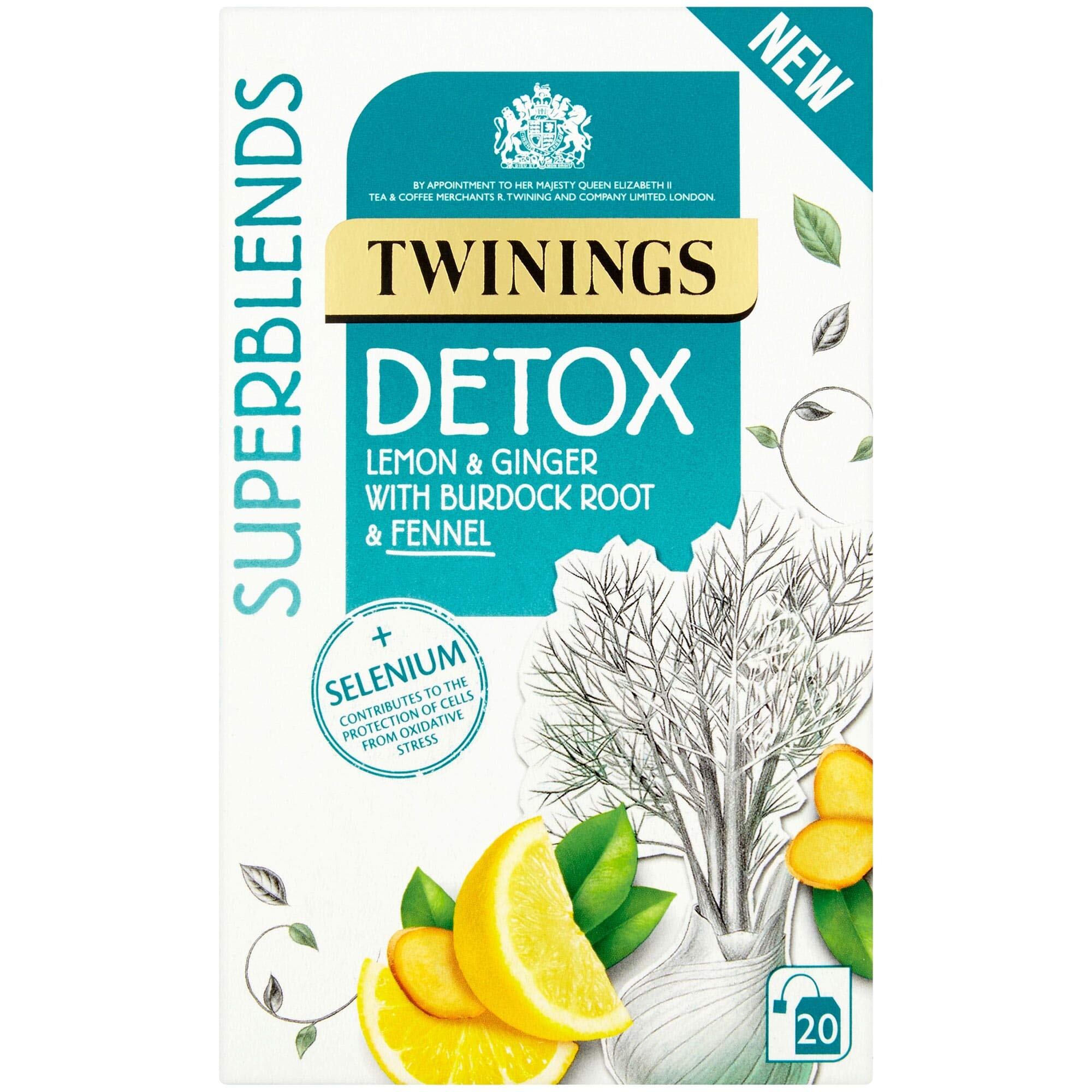A lemon-flavored infusion with added burdock root, fennel, ginger, and selenium. This super blend of herbal ingredients, including lemon peel, ginger, and selenium, all help protect cells from oxidative stress, helping you stay at your best. Winner of the 2018 Great Taste Award. Each box contains 20 individually wrapped tea bags. There are 4 boxes in each wholesale box. - Note: For nominal weighted products such as cheese and meat, etc., the weight listed on the product page is approximate and may vary, either higher or lower, depending on our supply. The price shown in this offer is an average price for the item and is a fixed, non-negotiable lot value. By ordering these items, you accept any potential variation in the item's weight. INGREDIENTS Fennel (20 ), lemon peel (16 ), lemongrass, burdock root (10 ), ginger (10 ), spearmint, natural lemon flavor with other natural flavors (7 ), rooibos, natural lemongrass flavor, verbena, selenium (1 ), natural basil flavor with other natural flavors. INSTRUCTIONS To prepare, place one tea bag in a cup, add boiling water, and let it steep for several minutes. This product is naturally caffeine-free and vegetarian. SAFETY WARNING Naturally caffeine-free and vegetarian. See moreTwinings Superblends Lot de 20 sachets de thé enveloppés DétoxDESCRIPTION DU PRODUIT DESCRIPTION DU PRODUIT Une infusion aromatisée au citron avec racine de bardane, fenouil, gingembre et sélénium ajouté. Ce super mélange d'ingrédients à base de plantes, y compris les écorces de citron, le gingembre et le sélénium, aide tous à protéger les cellules contre le stress oxydatif qui peut vous aider à rester au mieux. Lauréat du prix Great Goût 2018. Chaque boîte contient 20 sachets de thé emballés individuellement. Il y a 4 boîtes dans chaque boîte de gros. - Remarque : pour les produits pondérés nominaux tels que le fromage et la viande, etc., le poids indiqué sur la liste du produit est approximatif et peut varier, en hausse ou en baisse selon notre approvisionnement. Le prix indiqué dans cette offre est un prix moyen de l'article et est une valeur de lot fixe, non négociable. En commandant ces articles, vous acceptez toute variation potentielle du poids de l'article. INGRÉDIENTS Fenouil (20 ), écorce de citron (16 ), citronnelle, racine de bardane (10 ), gingembre (10 ), menthe verte, arôme naturel de citron avec d'autres arômes naturels (7 ), Rooibos, arôme naturel de citronnelle, verveine, sélénium (1 ), arôme naturel de basilic avec d'autres arômes naturels. MODE D'EMPLOI Pour préparer, placez un sachet de thé dans une tasse, ajoutez de l'eau bouillante et laissez infuser pendant plusieurs minutes. Ce produit est naturellement sans caféine et végétarien. AVERTISSEMENT DE SÉCURITÉ Naturellement sans caféine et végétarien. Voir plus