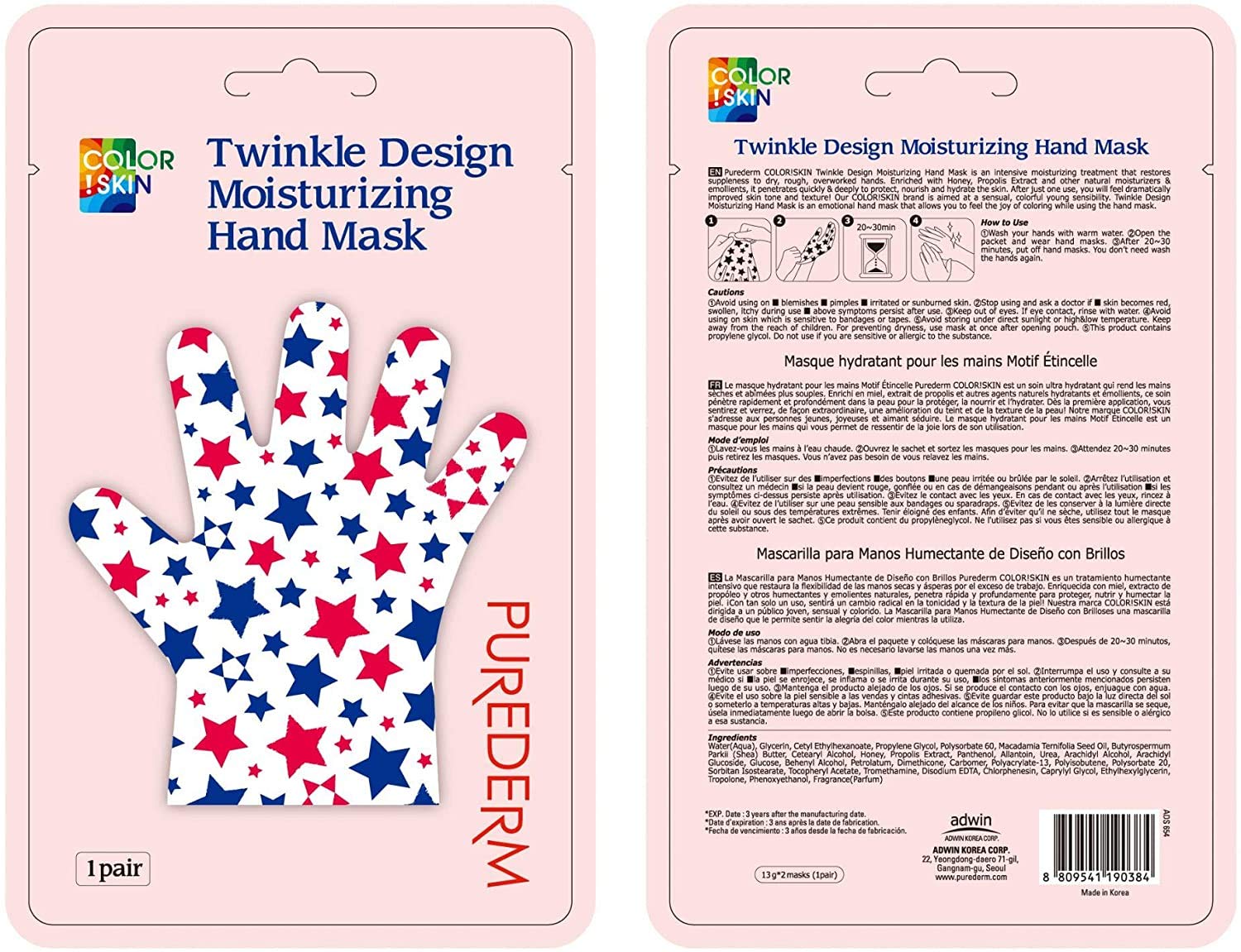 Color.Peau Twinkle Pattern Moisturizing Mask is an intensive hydrating treatment that restores suppleness to dry, calloused, and overworked hands. Enriched with honey, propolis extract, and other natural moisturizing and emollient agents, it penetrates quickly and deeply to protect, nourish, and hydrate the skin. After just one use, you will notice a significant improvement in skin tone and texture. Our Color.Peau brand aims for a youthful, sensual, and colorful sensibility. Twinkle Pattern Moisturizing Mask is an affective side mask that allows you to experience the joy of coloring while using the side of the mask.Enriched with honey, propolis extract, and other natural moisturizing and emollient agents. Restores suppleness to stiff, chapped hands.Couleur du masque.Peau Twinkle motif masque hydratant est un soin hydratant intensif qui restaure la souplesse à mains sèches, solide et surmenés. Enrichi avec du miel, extrait de propolis et d'autres agents hydratants et émollients naturels, il pénètre rapidement et en profondeur pour protéger, nourrir et hydrater la peau. Après une seule utilisation, vous sentirez considérablement amélioré la peau ton et la texture. Notre couleur.Peau marque vise à un jeune sensuel, coloré de sensibilité. Twinkle motif masque hydratant est un masque de côté affectif qui vous permet de sentir la joie de coloration tout en utilisant le côté du masque.Enrichi avec du miel, extrait de propolis et d'autres agents hydratants et émollients naturels. Restaure la souplesse à essayer, rigide et trop les mains.Twinkle Motif hydratante pour les mains Masque