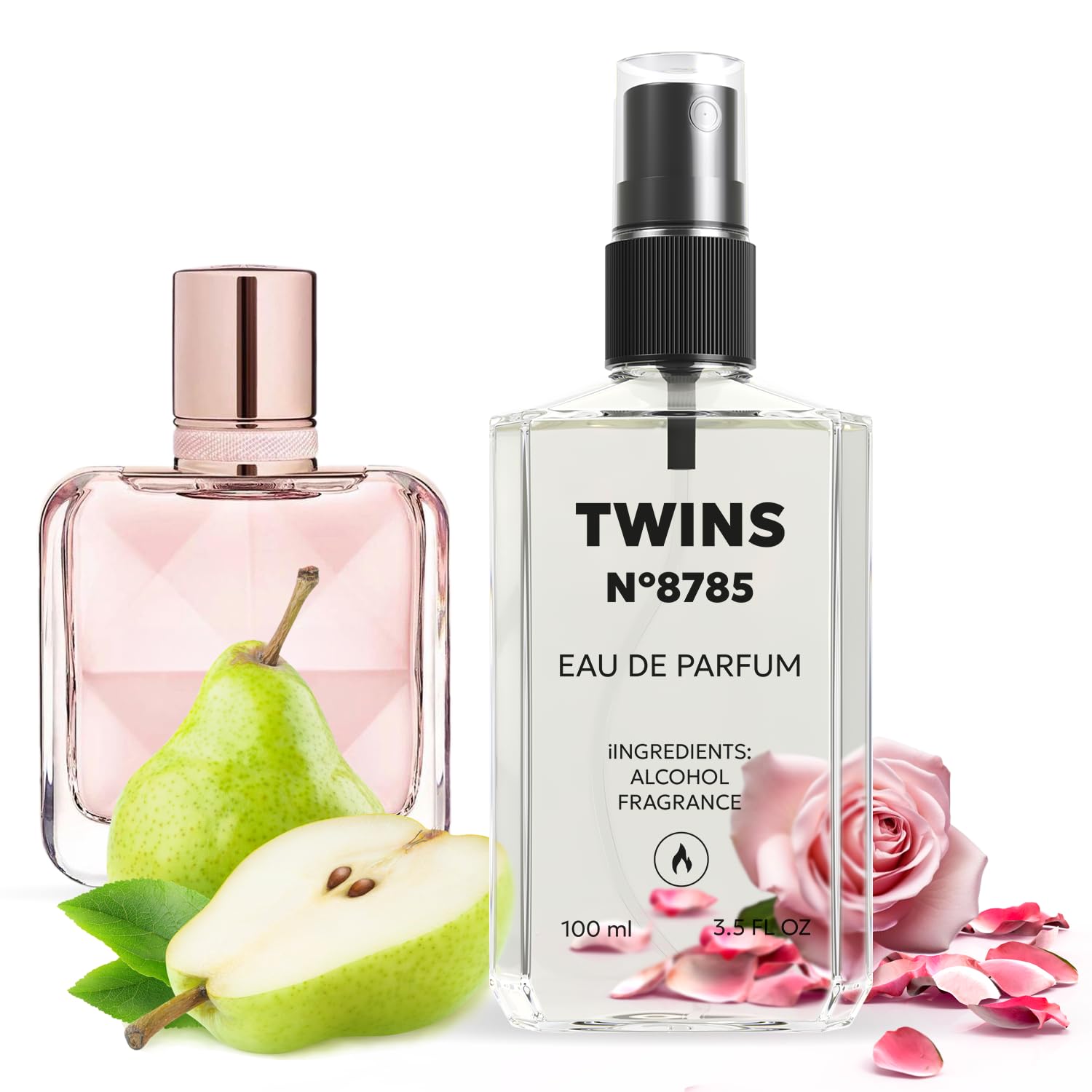 RECYCLABLE TRAVEL SIZE BOTTLE: An environmentally neutral compact plastic bottle that is fully recyclable. Fits easily in your bag and will not cause any reprimands during airport security checks. OPTIMAL PRICE-TO-QUALITY RATIO: Farewell to exorbitant luxury perfume prices! Choose TWINS to eliminate the 'Brand Tax' on your favorite fragrance. The brand of your perfume may not be visible, but the satisfaction of wearing TWINS is undeniable. Instead of investing in pricey designer fragrances, opt for TWINS. You won't regret it! Feel great and spend less. LONGEVITY OF FRAGRANCE: The scent lingers consistently for 6 hours on the skin and leaves a lingering trail on clothes for up to 12 hours, varying based on the aromatic group's characteristics. REFUND OR REPLACEMENT POLICY: In the event that you receive TWINS PARFUM perfume in a damaged or defective state, you are entitled to request either a refund or a replacement product. Ensuring your satisfaction is our utmost priority. SCENT TYPE: Fruity, Floral. Top notes: Pear, Ambrette. Middle notes: Rose, Iris. Base notes: Musk, Virginia cedar.