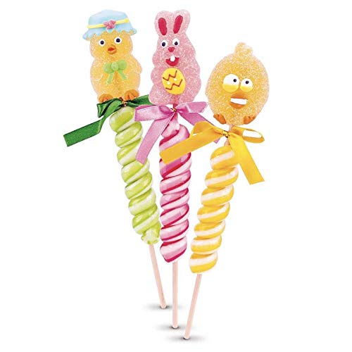 A treat as pretty as it is appetizing. This twisted lollipop is accompanied by either a rabbit, a cow or a chick. A mixture of boiled sugar and jelly that will be extremely popular with children looking for flavors. These boiled sugar lollipops accompanied by a small jelly candy animal will be a hit with your children! Ideal for Easter and to please children! Net weight: 65g pcs. INGREDIENTS Peanut freeWhat's the prettiest and most delicious Easter lollipop? Definitely the Hide and Seek Twisty lollipop! With pronounced flavors of strawberry, apple, or even orange! A delicious swirl lollipop with a small jelly candy at the top featuring Easter characters. 22 cm of boiled sugar available in packs of 3 or in a display of 12 lollipops. Une friandise aussi jolie qu'appétissante. Cette sucette, à la forme torsadée, est accompagnée soit d'un lapin, d'une vache ou d'un poussin. Un mélange de sucre cuit et de gélifié qui va faire extrêmement plaisir aux enfants en quête de saveurs. Ces sucettes en sucre cuit accompagnées d'un petit animal en bonbon gélifié feront fureur auprès de vos enfants ! Idéal pour Pâques et faire plaisir aux enfants ! Poids net : 65g pcs. INGRÉDIENTS Sans arachideQuelle est la sucette de Pâques la plus jolie et gourmande ? Certainement la sucette Cache-Cache twisty ! Avec des goûts prononcés de fraise, pomme ou encore d'orange ! Une délicieuse sucette tourbillon avec au sommet, un petit bonbon gélifié à l'effigie des personnages de Pâques. 22 cm de sucre cuit disponible par lot de 3 ou en présentoir de 12 sucettes.
