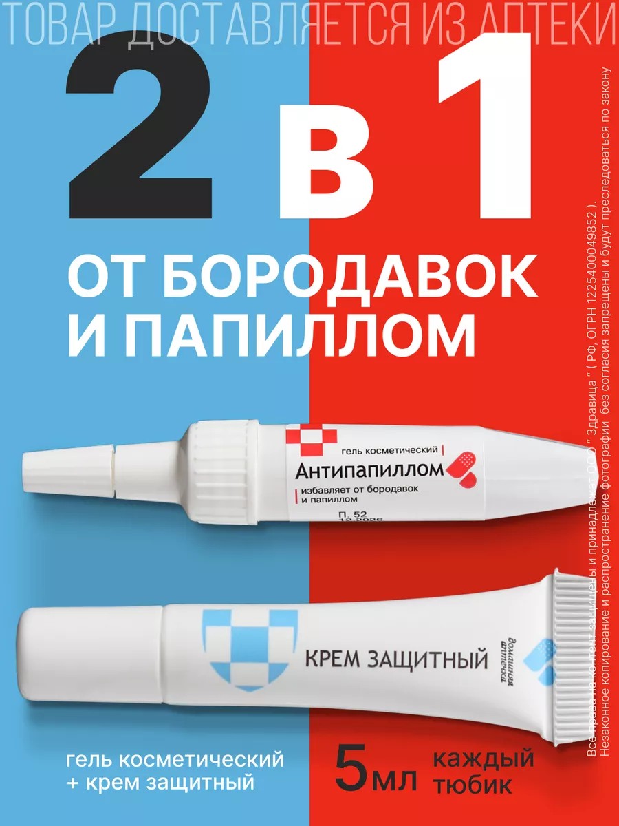 The Antipapillom anti-wart and papilloma treatment complex is designed for the care of skin with excess keratinization. Antipapillom is better than celandine for papillomas or celandine for warts! This healing complex includes Antipapillom gel and a protective cream. Working together, they allow you to quickly, safely, and effectively treat keratinized areas of skin and papillomas, while protecting healthy skin from damage. This medicinal cosmetic from the Home Medicine Cabinet series works like super celandine. Warts and papillomas begin to exfoliate within 1-2 days after the first application, and by 3-5 days, the skin is completely cleared, with visible results in less than 5 days. Before using the gel, pre-steam the keratinized areas of skin. Apply a protective body cream to the skin around the problem areas. Apply the gel to the keratinized area, avoiding healthy skin. Do not rinse off the product for at least 1-2 hours; if possible, leave it on for longer. After the product has been absorbed, any excess cream applied to protect healthy skin can be soaked with a napkin. After 1-2 days, the keratinized areas of the skin will begin to exfoliate, and after 3-5 days, they will be clear. If necessary, you can repeat the procedure, but not earlier than 3 days after the first application of Antipapillom gel. ATTENTION. Do not use the gel against acne and calluses, for facial skin care, in the groin and underarm area, on the mammary glands, or on moles. For adolescents, boys and girls, use under parental supervision. Avoid contact with Antipapillom gel on healthy skin and mucous membranes. If Antipapillom gel comes into contact with healthy skin, rinse with running water. If it gets into the eyes, immediately and for a longer period of time rinse with running water. Contains alkali. Avoid contact with eyes.