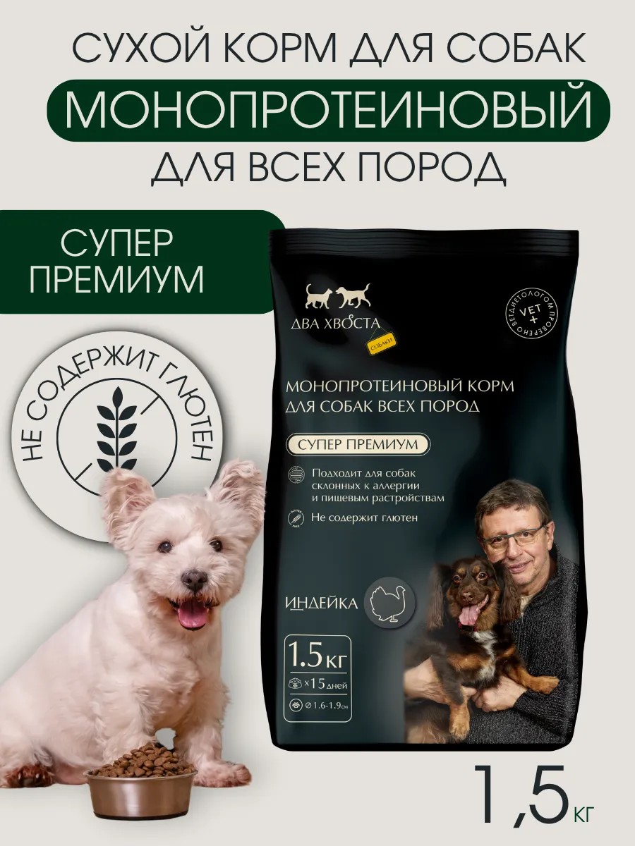 Сухой корм для собак Два Хвоста - вкусное лакомство на каждый день для вашего питомца! Сухой корм класса супер-премиум для собак всех пород имеет в своем составе натуральную свежую индейку. Он обеспечит вашего питомца всеми необходимыми питательными веществами, чтобы поддерживать его здоровье и хорошую форму. Еда для собак содержит витаминно-минеральный комплекс с кальцием. Корм не содержит консерванты, красители, усилители вкуса и другие добавки. Мы используем мясо индейки и самые свежие субпродукты, которые являются источником цинка, железа, минералов и витаминов группы В. Корм может быть использован в качестве основного рациона. Сбалансированный полнорационный продукт высокого качества - еда для ежедневного питания. Зоотовар премиум - качества нашей марки поставляется в упаковке весом 1,5 килограмма из высококачественных материалов. Наш сухой корм для собак разработали ветеринарный диетолог и зоозащитник Михаил Ширвиндт - идеальное решение для самых преданных хозяев, которые заботятся о здоровье и благополучии своего питомца. Купите корм для собак сейчас и убедитесь в его высоком качестве и эффективности. Не упустите возможность покормить вашу собаку лучшим!