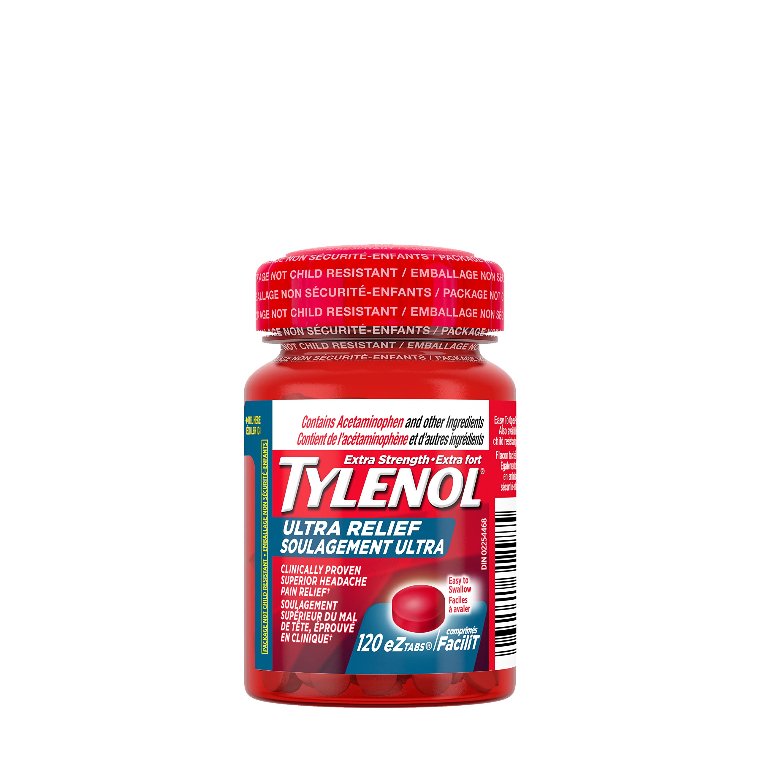 TYLENOL ULTRA RELIEF Tough on Headaches EZTABS contain an effective pain relief ingredient plus pain relief enhancer to provide superior relief of headache pain. Clinical studies have proven that an acetaminophen and caffeine combination relieves headache pain more effectively than acetaminophen alone.Clinical studies have proven that an acetaminophen and caffeine combination relieves headache pain more effectively than acetaminophen alone. Easy-to-swallow tablets, available in 20, 80 120-Count bottles. For mild to moderate migraine pain and headaches. Contains the pain reliever acetaminophen and the pain relief enhancer caffeine. Clinically proven superior headache pain relief .