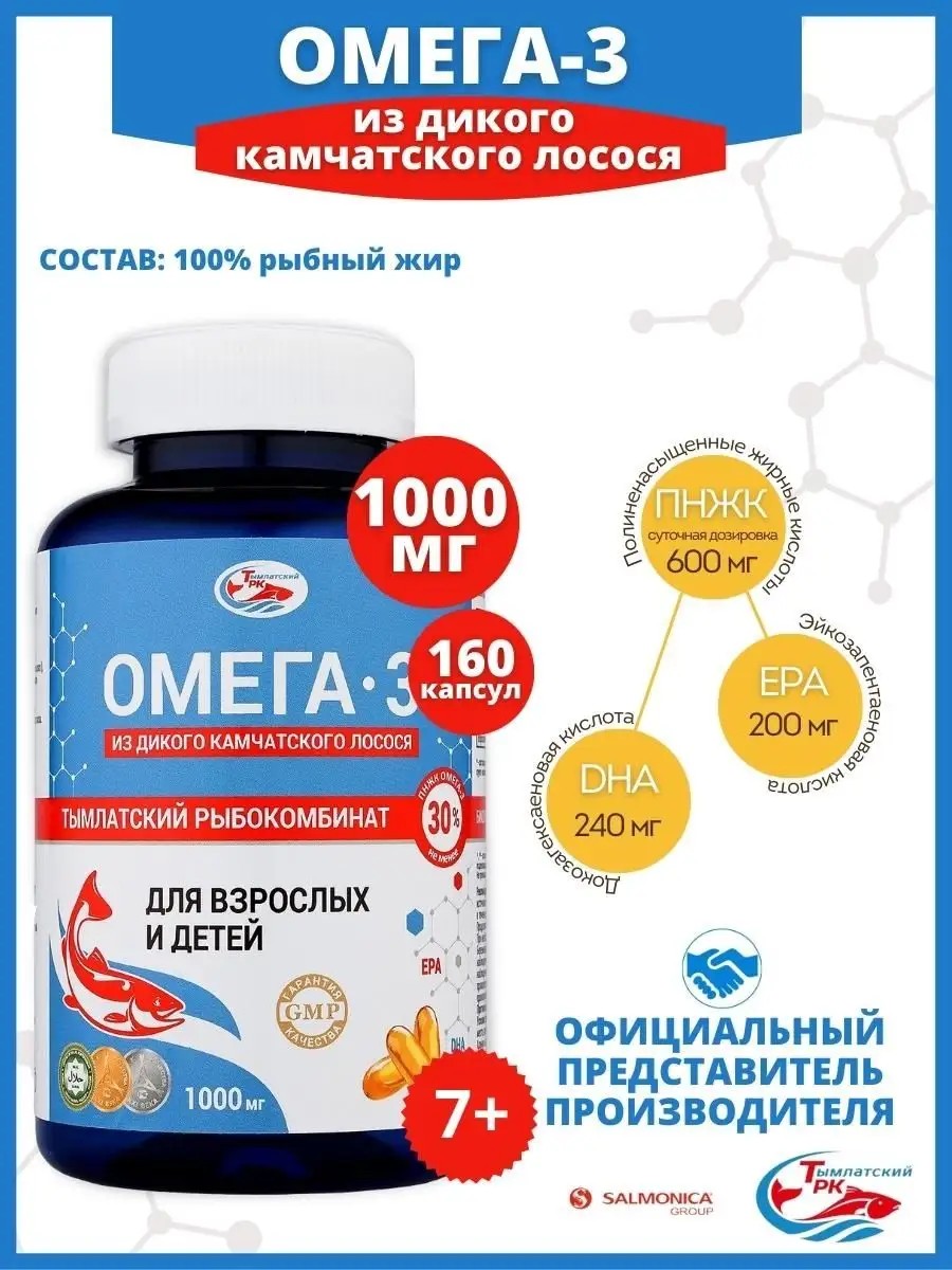 Омега 3 в капсулах 1000мг или 600 мг от Тымлатского рыбокомбината - Россия. Камчатский натуральный высокой концентрации и очистки, из дикой рыбы ценных сортов. Витаминный комплекс детский и взрослый камчатка высшего качества из рыбного жира содержит в себе незаменимые полиненасыщенные жирные кислоты: ЭПК ( эйкозапентаеновая кислота EPA ) и ДГК ( докозагексаеновая кислота DHA ). Омега- 3 из дикого камчатского лосося, капсулы 1000 мг., содержит в 2 капсулах: ПНЖК -600 мг, DHA 240 мг, EPA -200 мг. Омега-3 халяль отлично усваивается, а значит эффективнее других омег из обычной рыбы мелких пород. Биологические добавки, такие как рыбный жир добывают из мышечной ткани. Такой продукт является более чистым и безопасным. А рыбий жир из её печени - источник не только витаминов, но и вредных токсинов. Их рыба накапливает на протяжении жизни. Омега - это одна из базовых добавок - формула здорового образа жизни ЗОЖ в любом возрасте. Omega3 комплексные витамины и минералы для женщин молодых и в возрасте omega 3 подходит детям с 7 лет. Подростков девушек, мужчин и спортсменов. Насыщает организм витаминами A и D, что поддержит здоровье сердца при сердечно-сосудистых заболеваниях. Поможет также для похудения и памяти. Понижает уровень «плохого холестерина», который в избытке приводит к развитию атеросклероза и поражению сосудов. Обладает противовоспалительным эффектом и нормализует работу сальных желез, что помогает в устранении прыщей. Уменьшает проявления аллергии, кожных заболеваний, провоцирует ускорение обмена веществ. БАДы от Salmonica - улучшение работы мозга для памяти, почек. А также его называют витамин от стресса. Человеческий организм не может вырабатывать ПНЖК самостоятельно, поэтому важно получать их из пищевых источников. Ищете высококачественный источник омега 3 6 9 - вам обязательно стоит попробовать продукцию бренда Тымлатский рыбокомбинат. Одного из ведущих производителей рыбной продукции в России вообще и в регионе в частности. Omega не содержит сахара и ГМО. Витаминные комплексы женские - капсулы желатиновые с кислотами рекомендован при дефиците в организме жирных кислот, вызванном диетами, неправильным питанием, стрессом. Показания: слабый иммунитет, ломкие волосы и ногти, сухая кожа. Прием капсул омега3 помогает справиться с сезонными депрессиями и выровнять психоэмоциональное состояние. Детям необходим для роста костей, концентрации внимания, поддержания иммунитета. Бад для глаз зубов и кожи лица, для суставов и связок. Источник полиненасыщенных жирных кислот 3-6-9 - продукты из дикого лосося марки Салмоника. Попробуйте и сделайте лёгкий шаг к улучшению здоровья.