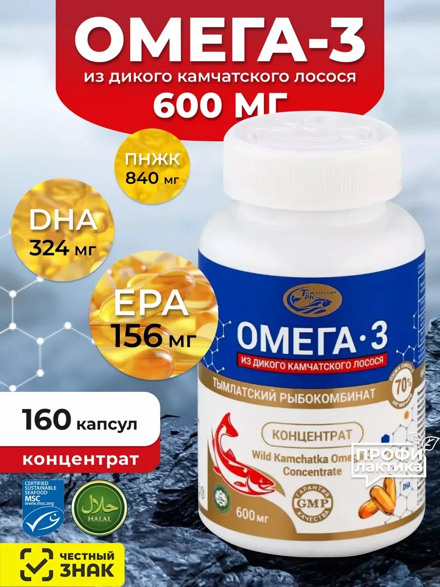 Quality confirmed by the State Register of Natural Resources and the Honest Sign system. Obtained by processing fish carcasses, which are a rich source of polyunsaturated fatty acids (PUFAs), essential for the cardiovascular system, immunity, and overall health, and not produced by the body itself. To obtain the required amount of PUFAs, we need to eat fatty fish several times a week, or replenish the deficiency using alternative methods. Today, food supplements are an excellent solution, as each capsule contains up to half the daily PUFA requirement for an adult. Taking two capsules twice a day provides a sufficient level of Omega-3 to meet the body's needs, maintaining health and tone. Long-term use of the supplement helps improve heart function, strengthen bone tissue, hair, and nails, accelerate metabolic processes, and normalize metabolism. Nutritional and energy value (average values) in 1 capsule: proteins 0.1 g, fats 0.6 g; 20 kJ / 5 kcal. Content in 2 capsules: Omega-3 PUFAs, not less than 840 mg including Docosahexaenoic acid (DHA) 324 mg. Eicosapentaenoic acid (EPA) 156 mg. Indications. The biologically active food supplement "Omega-3 from wild Kamchatka salmon concentrate" is an additional source of Omega-3 polyunsaturated fatty acids, including eicosapentaenoic acid and docosahexaenoic acid. Method of administration and dosage. Adults take 2 capsules daily during meals with plenty of water. It is recommended to consult a doctor before use. Pregnant and lactating women should take it on the recommendation and under the supervision of a doctor. Duration of admission: 3 months, if necessary, the intake can be repeated.