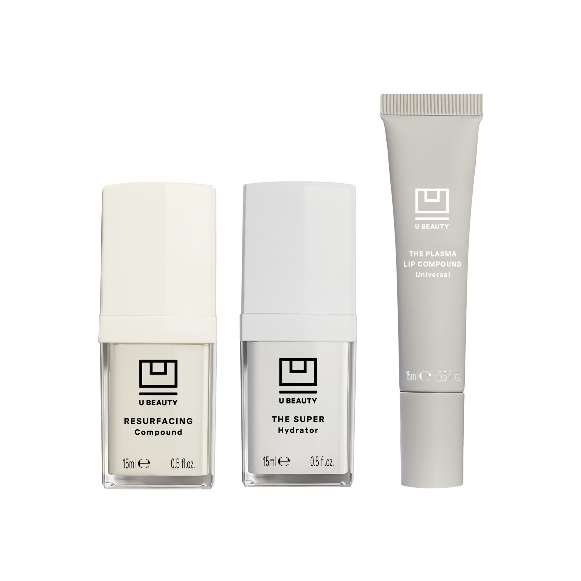 PROPRIETARY SIREN CAPSULE TECHNOLOGY – U Beauty's adaptive delivery system revolutionizes the way ingredients interact with your skin—for customized treatment transformative results. CLINICALLY TESTED – Effective for all skin types, and designed to simplify your routine with just three high-performance essentials. HYDRATED, REVIVED, AMPLIFIED – Skin looks instantly refreshed and supple, while lips appear volumized with a 3D cushion effect. VISIBLE ANTI-AGING RESULTS – Diminishes the look of fine lines and wrinkles, improves texture, evens tone, and restores a radiant, youthful-looking glow. COMPLETE ESSENTIAL ROUTINE – Three bestsellers in one set: the Resurfacing Compound to visibly brighten and refine skin, The SUPER Hydrator to lock in up to 48 hours of hydration, and The PLASMA Lip Compound for visibly plumped, smoothed lips.