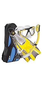 EXPLORE ANYWHERE: The compact gear bag makes it easy to store and transport your snorkel equipment and has a mesh panel for quick drying to avoid mildew buildup on your gear. Whether you’re a first-time diver or a seasoned professional this set will amplify your next adventures. DUAL FINS: The large dual composite fins with vented blades provide excellent power and energy-saving efficiency with soft closed-heel foot pocket will snug and fit comfortably on your barefoot for sizes 9.5 - 11.5 shoe size enhance your snorkeling adventures when exploring and uncovering new depths. SNORKEL: The Seabreeze snorkel has a comfortable, ergonomically-shaped mouthpiece designed to reduce jaw fatigue, and a one-way purge to easily clean any accumulated water. With Splash guard top uses Hydro-adhesion technology to prevent splashed water from entering snorkel barrel. EASY-TO-USE: The Cozumel mask has a 3-Way adjust Pro-Glide buckle that allows you to easily fit the mask to your face for maximum comfort. Low profile two-window design and tempered glass lens offer a secure, leak-free, anti-fog experience streamlined fit for hours of comfortable, clear view exploring. COZUMEL SNORKELING SET: Comfort is key when it comes to underwater exploration. The ergonomically-designed snorkel set is made with dual-material construction that gives you a flexible, secure, customizable fit. Cozumel set includes an adult mask, snorkel, dual fins, and a travel bag. Fins are large and fit 9.5-11.5.