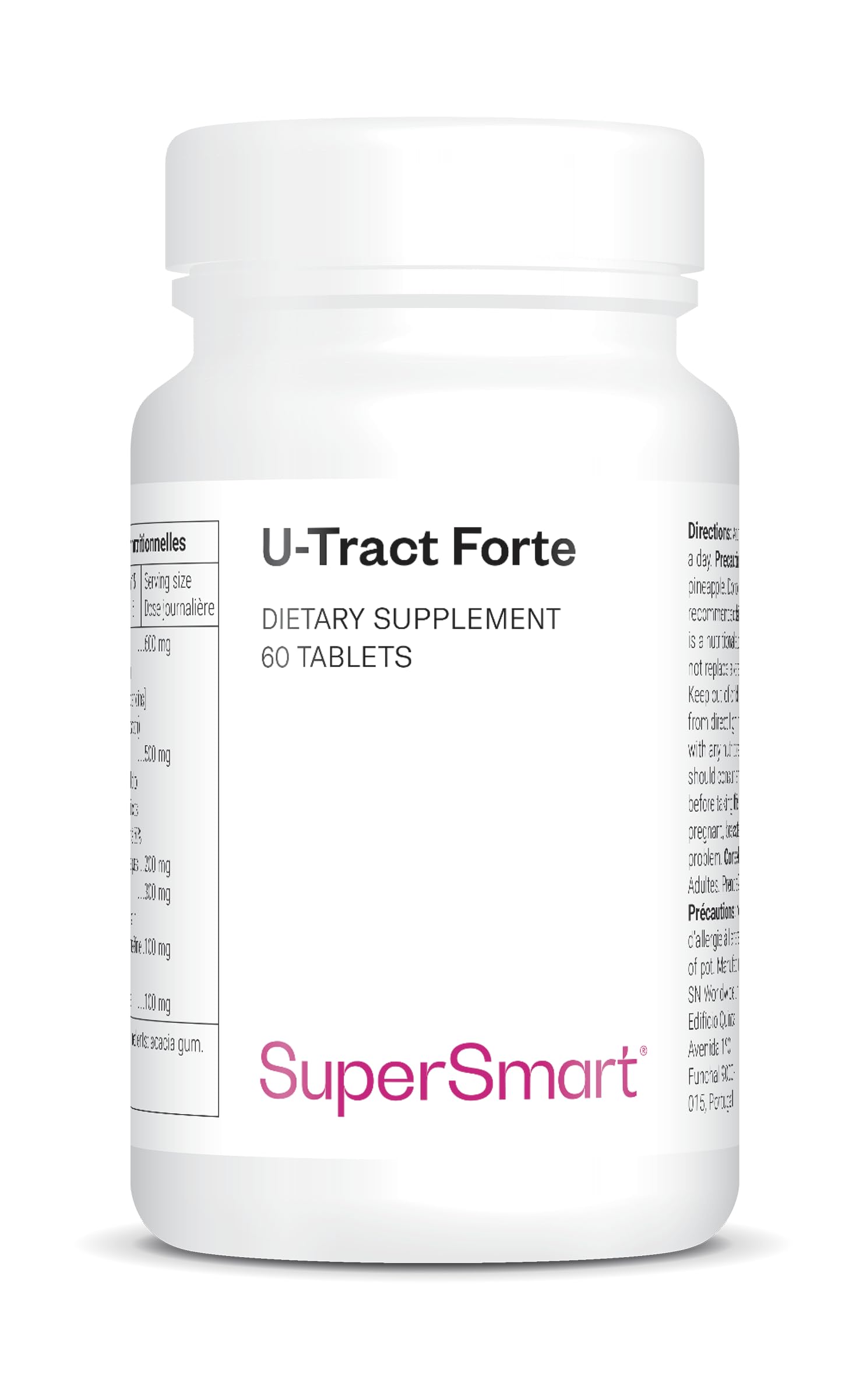 SATISFACTION GUARANTEED: We strive to offer you a range of highly effective products, along with exceptional customer service. If you have any questions or concerns, please feel free to contact us at any time. We are here to help you become the best version of yourself. DIRECTIONS FOR USE: Take 2 to 4 tablets daily as directed by your healthcare professional. This product is a nutritional supplement and should not be used as a substitute for a balanced and varied diet or a healthy lifestyle. Keep out of reach of children, away from light, heat, and moisture. NATURAL INGREDIENTS: Our supplement contains a patented cranberry extract (CranMax). Vegan and gluten-free formula! At Supersmart, we choose raw materials rich in active ingredients. We also prioritize eco-responsible practices and natural excipients. OPTIMAL URINARY COMFORT: U-Tract Forte is a food supplement designed to naturally soothe urinary discomfort. With its patented cranberry extract, D-mannose, hibiscus, Java tea, and dandelion, it offers a complete and effective formula. Suitable for women over 60, men over 50, and also for those who have difficulty holding their urine. ? SUPERSMART: With over 30 years of expertise, we are one of the leading brands in Europe to market food supplements. Our formulas are developed by an in-house team of specialists. With hundreds of thousands of satisfied customers, SUPERSMART is a key player in nutritional supplementation.SATISFACTION GARANTIE : Nous mettons tout en œuvre pour vous proposer une gamme de produits hautement efficaces, tout en vous offrant un service client exceptionnel. Si vous avez des questions ou des préoccupations, n'hésitez pas à nous contacter à tout moment. Nous sommes là pour vous aider à devenir la meilleure version de vous-même. CONSEIL D'UTILISATION : Prendre 2 à 4 comprimés par jour selon les conseils de votre thérapeute. Ce produit est un supplément nutritionnel et ne doit pas être utilisé en remplacement d'une alimentation équilibrée et variée, ni d'un mode de vie sain. Conservez hors de portée des enfants, à l'abri de la lumière, de la chaleur et de l'humidité. DES INGRÉDIENTS NATURELS : Notre supplément contient un extrait breveté de cranberry (CranMax). Formule Vegan et sans gluten ! Chez Supersmart, nous choisissons des matières premières riches en ingrédients actifs. Nous privilégions aussi les démarches éco-responsables et les excipients naturels. UN CONFORT URINAIRE OPTIMAL : U-Tract Forte est un complément alimentaire conçu pour apaiser naturellement les gênes urinaires. Avec son extrait breveté de canneberge, D-mannose, hibiscus, thé de Java et pissenlit, il offre une formule complète et efficace. Convient aux femmes de plus de 60 ans, aux hommes de plus de 50 ans mais aussi aux personnes qui ont du mal à se retenir. ? SUPERSMART : 30 ans d'expertise, nous sommes l'une des premières marques en Europe à commercialiser des compléments alimentaires. Nos formules sont mises au point par une équipe de spécialistes en interne. Avec des centaines de milliers de clients satisfaits, SUPERSMART figure comme un acteur incontournable de la supplémentation nutritionnelle.U-Tract Forte - Confort Urinaire - Extrait de Canneberge Breveté CranMax - D-Manose, Bromélaïne, Pissenlit, Hibiscus, Cranberry - Atténue les gênes urinaires - Vegan - Sans Gluten - SuperSmart