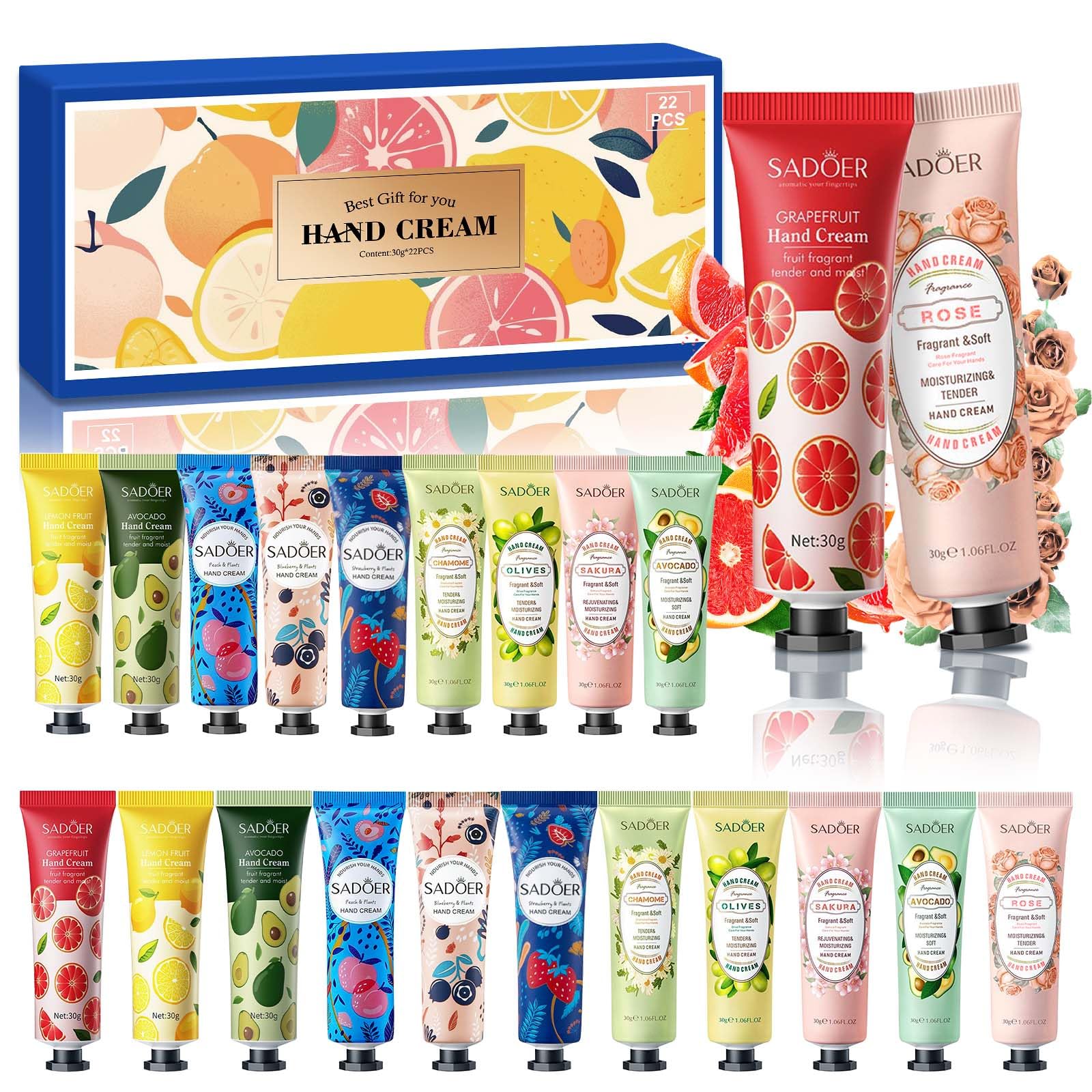 Pack of 22 Hand Creams - Christmas Gift - Hand Cream - Fruity and Floral Scent - Cream for Dry and Chapped Hands - For Men and Women INSTRUCTIONS FOR USE Apply the hand cream to your hands, massage in, and use as needed, especially after washing your hands or after exposure to harsh conditions. SAFETY WARNING Please use under adult supervision. See morePerfect Winter Gift: Comes in an elegant gift box, making it an ideal present for yourself, friends, colleagues, Christmas, Valentine's Day, Mother's Day, birthdays, and anniversaries during the cold winter months. Easy to Carry: The hand cream is small and portable, making it very convenient to carry. At 30g each, this cute mini hand cream easily slips into your pocket, backpack, or purse and can be conveniently carried. You don't have to worry about dry, cracked skin caused by the cold while traveling, commuting to work, or going out. Suitable for All Skin Types: Our herbal hand cream helps restore the skin's natural protective barrier in just a few days. It's refreshing, non-sticky, absorbs quickly, and lasts a long time. It leaves dry skin smooth and supple. Suitable for all skin types. Protect Your Skin: Our hand cream deeply moisturizes and rejuvenates the skin on your hands. Its moisturizing and refreshing properties contribute to the skin's overall health and well-being. Botanical scented hand cream kit: This set of 22 hand creams contains 11 scents, including rose, peach, avocado, olive, lemon, blueberry, cherry blossom, chamomile, strawberry, and grapefruit. A different scent every day – surprises and moods guaranteed.UCAMP Lot de 22 crèmes pour les mains - Cadeau de Noël - Crème pour les mains - Parfum fruité et floral - Crème pour les mains sèches et gercées - Pour homme et femmeDESCRIPTION DU PRODUIT DESCRIPTION DU PRODUIT Lot de 22 crèmes pour les mains - Cadeau de Noël - Crème pour les mains - Parfum fruité et floral - Crème pour les mains sèches et gercées - Pour homme et femme MODE D'EMPLOI Appliquez la crème pour les mains sur les mains, massez et utilisez-la si nécessaire, en particulier après le lavage des mains ou après le contact avec des conditions difficiles. AVERTISSEMENT DE SÉCURITÉ Veuillez utiliser sous la surveillance d'un adulte Voir plusCadeau d'hiver parfait : livré dans une élégante boîte cadeau, cadeau idéal pour vous-même, vos amis, vos collègues, Noël, la Saint-Valentin, la fête des mères, les anniversaires et les anniversaires en hiver froid. Facile à transporter : la crème pour les mains est petite et portable, ce qui la rend très confortable à porter. Avec 30 g chacun, cette jolie mini crème pour les mains se glisse facilement dans votre poche, sac à dos ou sac à main et peut être facilement transportée. Vous n'avez pas à vous soucier de la peau sèche et craquelée causée par la peau froide en voyage, sur le chemin du travail ou en sortant. Convient à tous les types de peau : notre crème pour les mains à base de plantes aide à restaurer la barrière protectrice naturelle de la peau en quelques jours. Il est rafraîchissant, non collant, pénètre rapidement et dure longtemps. Rend la peau sèche lisse et souple. Convient à tous les types de peaux. Protégez la peau : notre crème pour les mains hydrate et rajeunit la peau des mains en profondeur. Hydratant et rafraîchissant jouent un rôle dans la coordination et le soin de la peau. Kit crème pour les mains au parfum botanique : le lot de 22 crèmes pour les mains contient 11 parfums, dont rose, pêche, avocat, olive, citron, myrtille, fleur de cerisier, camomille, pêche, fraise et pamplemousse. Chaque jour, il y a un parfum différent chaque jour surprises et humeurs.