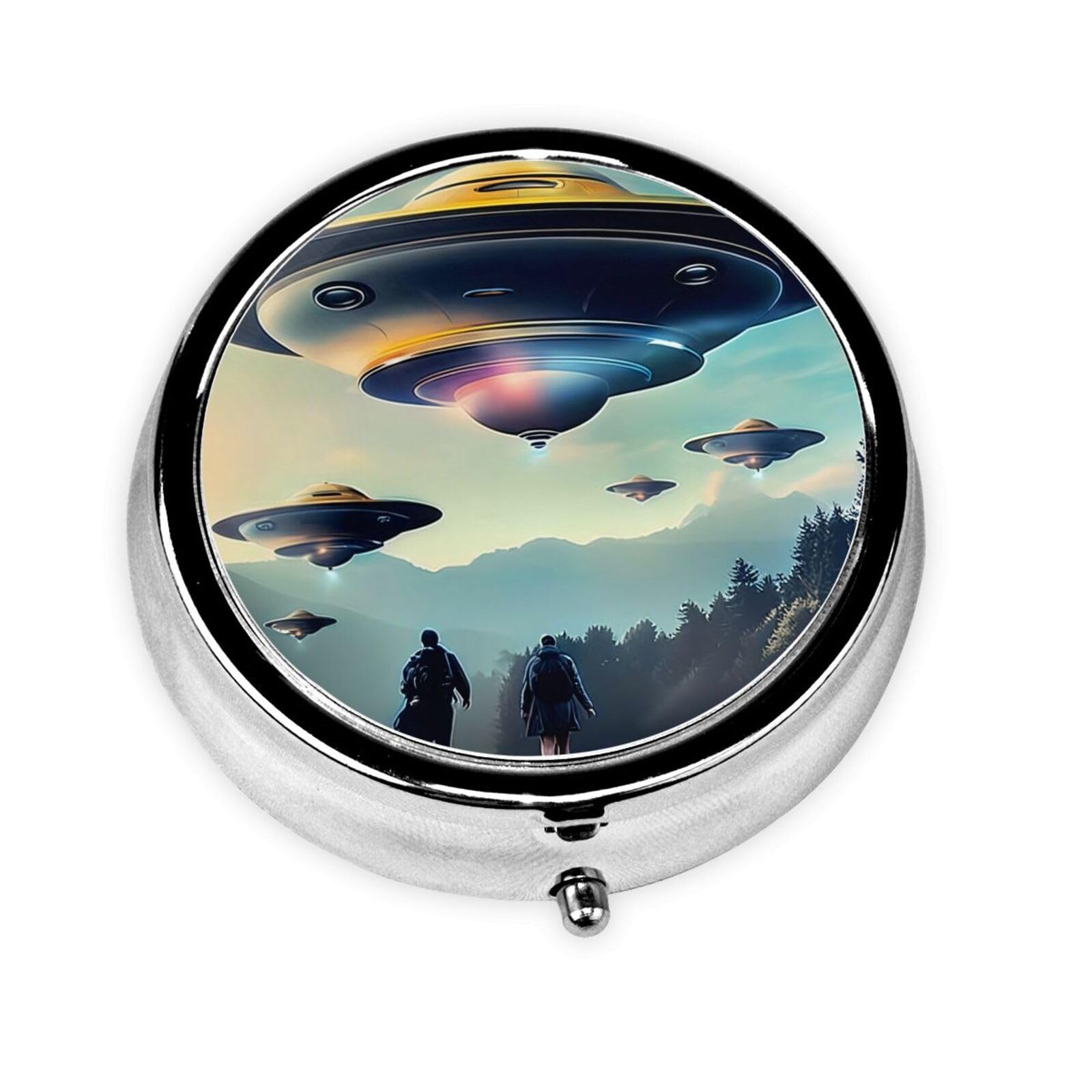 UFO Landing Portable Metal Pill Box Round Mini 3-Compartment Plastic Insert hinged Fastening Design Suitable for Small Pills Must-Have for Travel