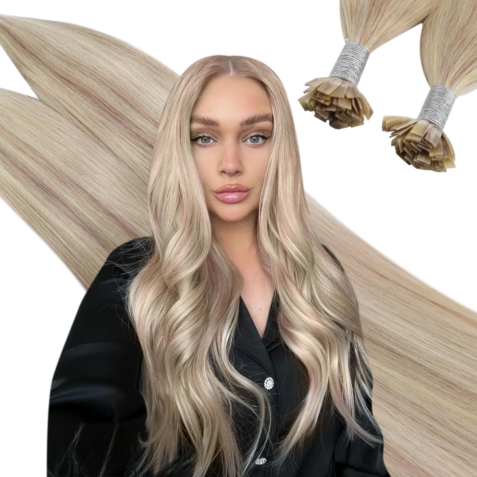 U Tip Hair Extensions are made from remy real hair to offer you the highest quality and choose the best raw material.The expressions of U-tip/nail tip/pre-bound hair extension are often used to describe the same.This is just a way to describe the shape of the keratin at the end of each strand.The keratin has the shape of a U or nail so that it melts quickly and easily against the hair and a dense connection is received.The stranding of the application system and the possibility of attaching the tips very close to the hairline ensure that the adhesions are practically not detectable for a result that is as natural as possible. How to apply 1. Hair in the first section (always cut hair from bottom to top) 2. Use the separator at the root to protect your scalp from heat 3. Pull the hair through the hole of the separator by turning several hair and then pulling through the hair 4. Set the pre-binding U-TIP extension under your own hair 5. Place the merger rod under the hair 6. Complete the merger rod for a few seconds, melt the glue and smear it around every hair 7. If the glue has melted, roll the glue between your fingers until the glue becomes cylindrical and secure the extension in your place. Warm tip Shampoo hair within 52 hours after wearing! Warnings No warning ?Crafts? Utips fusion hair extensions white blond, use of hot fusion.We advise you on professional application and distance.?Hair use? UGEAT hair use real human hair, the U-tip hair extensions white blond is silky smooth and the hair life of 6-10 weeks (depending on use and care methods).We recommend 2-3 packs to increase the volume and 3-8 packs to extend the length.?Frisur? Utips black hair extensions can be smoothed, lured, washed, residue and colored - only to darker color.If you style your hair, the heating temperature 184 ? should not exceed.Just like your own hair, you need to use styling products to style after curls, and timely washing and maintaining with essential oils will keep your hair smooth again.?Color & specifications? The white hair for u lace hair extensions hot fusion.Size: 14-24inch;Weight: 54g/pack.There can be color differences due to monitors.Please refer to the color of the product instead of the model.?Remy real hair? Utip hair extensions hot fusion is a perfect choice for people who are looking for long -term extensions, your hair can be very natural, healthy with natural hair shine, no hair loss and involvement freely adapt.Remy human hair, no mixed animal or synthetic hair. U Tip Hair Extensions werden aus remy Echthaar hergestellt, um Ihnen die höchste Qualität zu bieten und das beste Rohmaterial zu wählen. Die Ausdrücke U-Spitze/Nagelspitze/vorgebundene Haarverlängerung werden häufig verwendet, um dasselbe zu beschreiben. Dies ist lediglich eine Möglichkeit, die Form des Keratins am Ende jeder Strähne zu beschreiben. Das Keratin hat die Form eines U oder Nagels, damit es schnell und einfach gegen das Haar schmilzt und eine dichte Verbindung eingeht. Das strangweise Applikationssystem und die Möglichkeit, die Spitzen sehr nahe am Haaransatz anzubringen, sorgen dafür, dass die Verklebungen für ein möglichst natürlich wirkendes Ergebnis praktisch nicht nachweisbar sind. So bewerben Sie sich 1.Haar im ersten Abschnitt (Haare immer von unten nach oben abschneiden) 2.Setzen Sie den Separator an der Wurzel ein, um Ihre Kopfhaut vor Hitze zu schützen 3.Ziehen Sie das Haar durch das Loch des Separators, indem Sie mehrere Haare drehen und dann durch das Haar ziehen 4.Setzen Sie die vorgebondete U-Tip-Verlängerung unter Ihr eigenes Haar 5.Stellen Sie den Fusionsstab unter das Haar 6.Schließen Sie den Fusionsstab für einige Sekunden, schmelzen Sie den Kleber und schmieren Sie ihn um jedes Haar 7.Wenn der Kleber geschmolzen ist, rollen Sie den Kleber zwischen Ihren Fingern, bis der Kleber zylindrisch wird, und sichern Sie die Verlängerung an ihrem Platz. Warmer Tipp Haare nicht innerhalb von 52 Stunden nach dem Tragen shampoonieren! WARNHINWEISE no warning?Handwerk?Utips Fusion Hair Extensions weiß blond, Verwendung von heißer Fusion.Keratinkleber ist sanft für das Haar und bietet eine langanhaltende Bindung, die es dem Haar immer noch ermöglicht, sich natürlich zu bewegen. Wir beraten Sie bei der fachgerechten Anwendung und Entfernung. ?Haargebrauch?Ugeat Hair verwenden echtes Menschenhaar, die U-Spitze Haarverlängerungen weiß blond ist seidig glatt und die Haarlebensdauer von 6-10 Wochen (abhängig von Verwendung und Pflege Methoden). Wir empfehlen 2-3-Packungen, um das Volumen zu erhöhen, und 3-8-Packungen, um die Länge zu verlängern. ?Frisur?Utips Black Hair Extensions können geglättet, gelockt, gewaschen, restyled und gefärbt werden – nur bis dunklere Farbe. Wenn Sie Ihr Haar stylen, sollte die Heiztemperatur 184? nicht überschreiten. Genau wie Ihr eigenes Haar müssen Sie Stylingprodukte verwenden, um nach Locken zu stylen, und rechtzeitiges Waschen und Pflegen mit ätherischen Ölen wird Ihr Haar wieder glatt halten. ?Farbe & Spezifikationen?Das weiß Haar für u Spitzenhaarverlängerungen heiße Fusion. Größe: 14-24inch; Gewicht: 54g/Packung. Es kann Farbunterschiede aufgrund von Monitoren geben. Bitte beziehen Sie sich anstelle des Modells auf die Farbe des Produkts. ?Remy Echthaar?Utip Hair Extensions Hot Fusion ist eine perfekte Wahl für Menschen, die nach langfristigen Extensions suchen, kann Ihr Haar sehr natürlich, gesund mit natürlichem Haarglanz, keinen Haarausfall und Verwicklung frei anpassen. Remy Menschliches Haar, kein gemischtes Tier oder synthetisches Haar.Ugeat Bonding Extensions Blond Highlights Extensions Echthaar Aschblond Strähne Extensions Sehr Lang Flat Tip Extensions 55 cm 50 gramm 50 stk #18/613 22 Zoll 3.Flat Tip #18p613