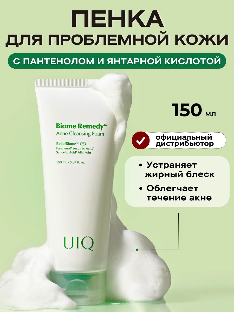 UIQ Biome Remedy Acne Cleansing Foam, a gentle cleansing foam with salicylic acid, effectively yet gently cleanses skin without drying or tightening, reduces the appearance of acne, fights breakouts, eliminates shine, and eliminates blackheads. This cleanser gently exfoliates, evens skin tone, soothes, restores the skin's protective barrier, and intensely moisturizes. Testing shows that the foam instantly removes 99% of sebum and impurities, clears pores of comedones by 98%, and improves the condition of oily skin by 11%. The product contains the most effective active ingredients for problem skin: probiotics, BHA acid, succinic acid, panthenol, and allantoin. This cleansing treatment gently mattifies the skin and prevents breakouts and irritation. Innovative Korean cosmetics will give your skin gentle yet intensive facial care. The foam is suitable for the care of men's and women's skin, as well as for teenagers.