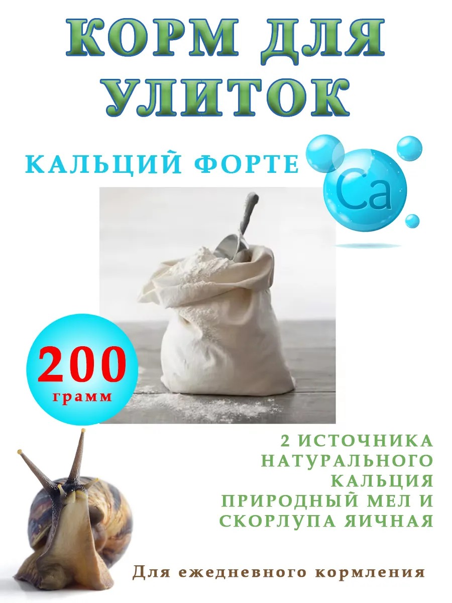 Корм для улиток и рептилий 2 в 1. (100 грамм мел кормовой и 100 грамм яичная скорлупа) Природный минерал кальций -важнейший элемент для жизнедеятельности всех живых организмов. Без него невозможно формирование костной ткани, а значит существования многочисленной группы позвоночных и самого венца природы -человека. Однако и беспозвоночные не могут жить без кальция, мел для улиток служит источников минерала, который образует прочную и красивую раковину. Если в рационе нет этой важнейшей составляющей, ракушки моллюсков становятся мягкими и ломкими, а рост панциря у малышей замедляется или прекращается вовсе. Так же в нашем ассортименте для улиток есть подкормки " Злаковая каша" и "Каша-Малаша".