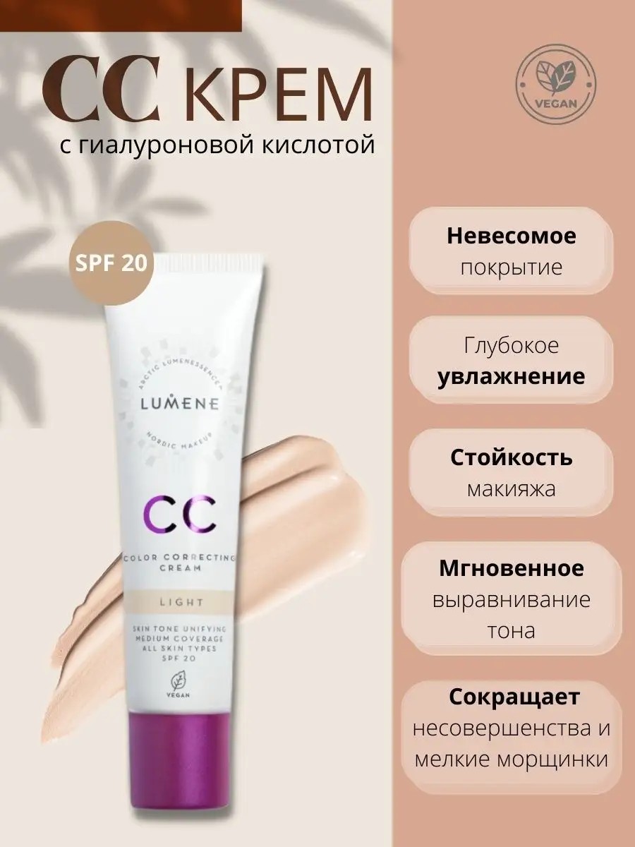 CC крем Lumene с SPF20 обладает воздушной легкой текстурой, ложится на лицо равномерным слоем, подстраивается под естественный тон кожи. Тональный крем не забивает поры, не заметен на лице не провоцирует воспаления, скрывает пигментные пятна. Подходит для всех типов кожи (жирной, сухой, комбинированной, нормальной). Тональный крем для лица обеспечивает защиту от солнца благодаря SPF20. CC крем универсальное тональное средство по уходу за кожей с бежевым оттенком, обладает легкой кремовой текстурой не сушит кожу и дарит ей ощущение комфорта, отлично наносится и распределяется. СС крем для лица включает брусничный экстракт и кристально чистую воду из Арктики, а также гиалуроновую кислоту и не требует нанесения питательного крема для лица. Тональник стойко держится весь день. CC cream идеально подходит для всех типов кожи(сухая, жирная, нормальная,проблемная). Тоналка для лица придает лицу здоровый и ровный оттенок, не скатывается даже при жаркой погоде.тональный крем