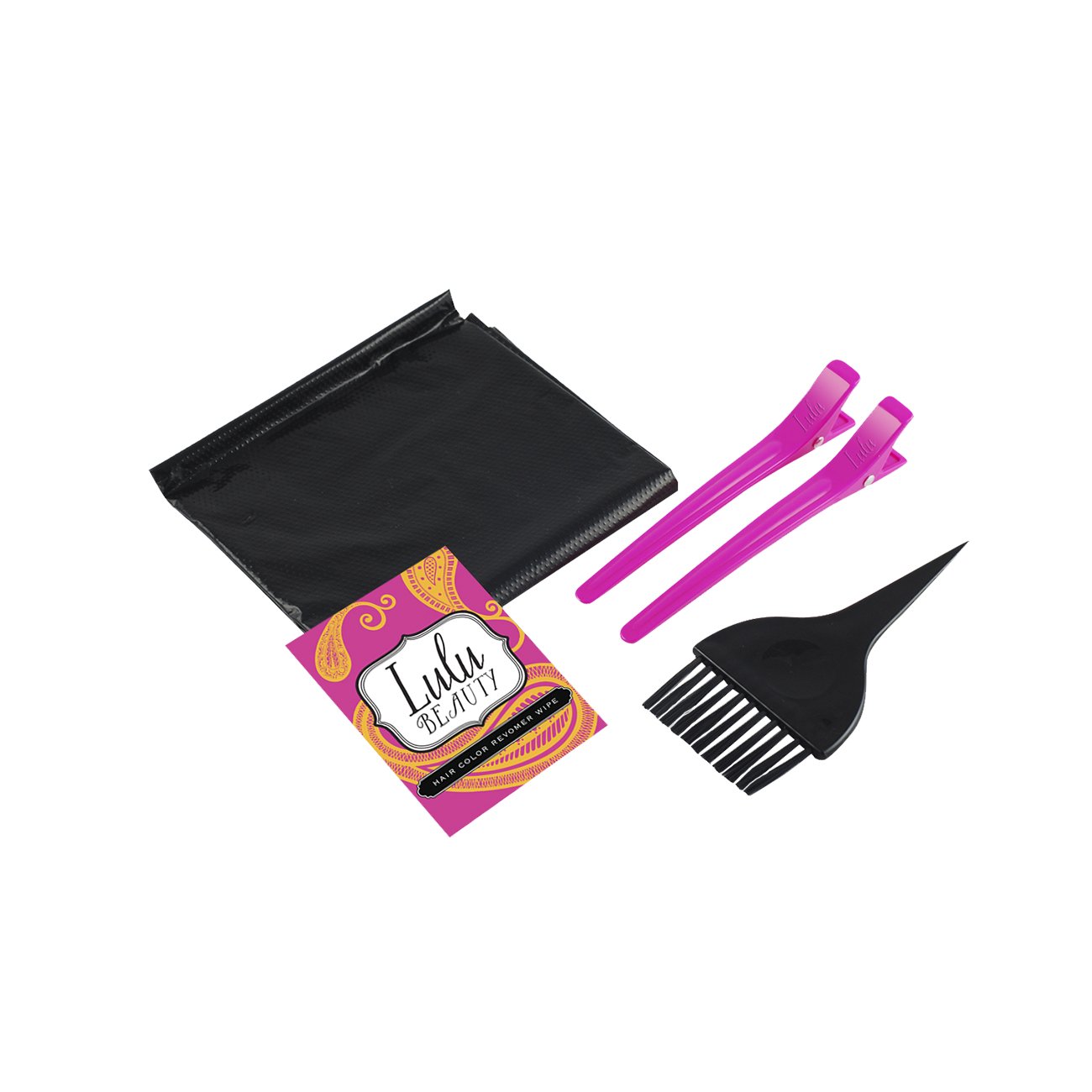 The Lulu Beauty Hair Color Kit contains every tool you need to get professional results from your DIY at-home hair color! Each kit includes a disposable cape to protect skin and clothing from hair color splatters and spills; 2 clips for sectioning the hair; a hair color applicator brush for applying hair color evenly; and a hair color remover wipe for removing unwanted hair color stains around the face and neck area.