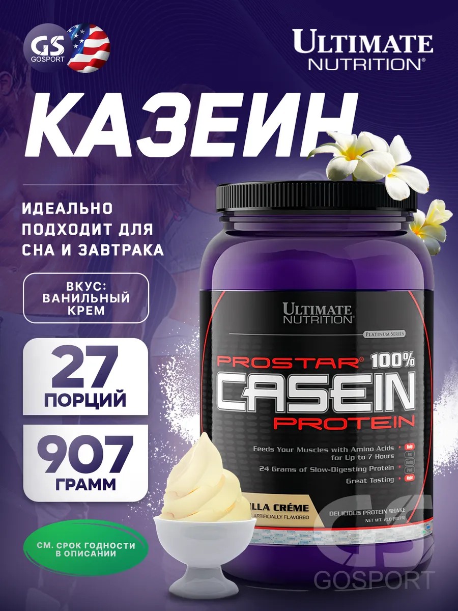 Expires until February 28, 2028. PROSTAR 100% CASEIN 907 Casein Protein, Vanilla Cream. Ultimate Nutrition PROSTAR 100% CASEIN is a high-quality protein that's ideal for achieving your fitness goals. This product is based on anti-catabolic micellar casein and casein hydrolysate, which are slowly absorbed by the body. While the body benefits from rapid protein absorption before and after workouts, slow absorption is more effective at other times. Casein is the main protein in cow's milk. Due to its structure, it is extremely sensitive to pH levels and the acidic environment of the stomach, and therefore breaks down relatively slowly. Consuming casein helps reduce catabolic processes (muscle breakdown) and promotes active muscle growth. This protein shake provides professional nutrition for athletes and individuals seeking maximum results in their training. Ultimate Nutrition Casein is the ideal sports nutrition supplement, offering a wide range of amino acids essential for muscle growth and recovery. This product is suitable for both women and men seeking to achieve their ideal physique. Whether your goal is to gain mass or lose weight, Ultimate Nutrition PROSTAR 100% CASEIN will be an indispensable aid in achieving your goals. Thanks to casein hydrolysate, this product provides additional nutrition for muscle growth and post-workout recovery. Ultimate Nutrition PROSTAR 100% CASEIN is more than just a protein drink; it will become your body's reliable ally on the path to achieving athletic results. Enjoy all the benefits of this product and achieve maximum results in your athletic endeavors. Directions: Mix 2 scoops (33 g) with 170 g of water or low-fat milk. Take before bed and throughout the day, depending on your protein needs.