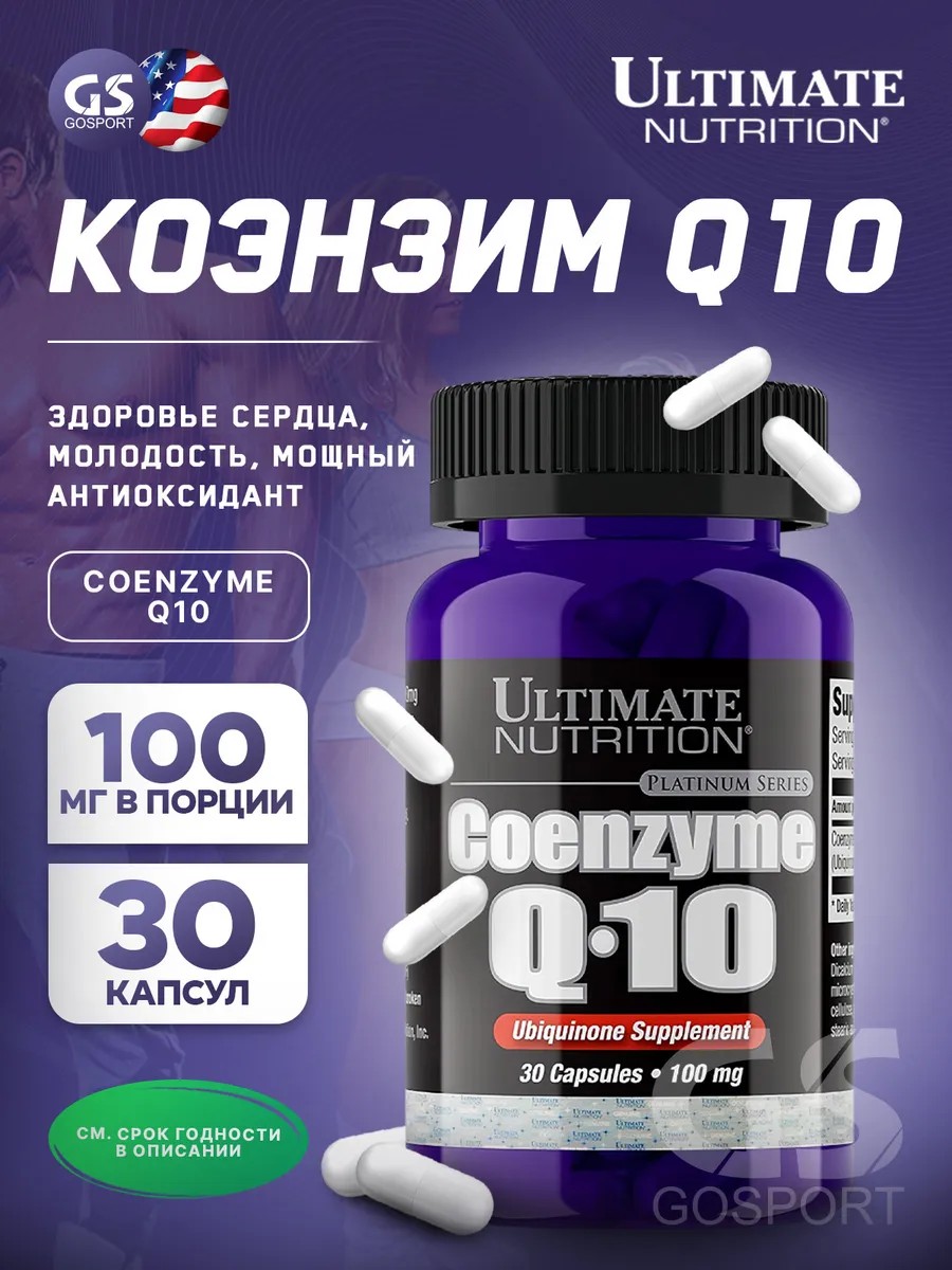 Expires until January 31, 2028. Coenzyme Q10 30 capsules. Coenzyme Q10 is a vitamin-like compound that plays a vital role in the body's health. This powerful antioxidant is essential for maintaining the cardiovascular system, skin, hair, nails, muscles, and brain. Coenzyme Q10 is the ideal supplement to your daily diet to maintain youth and health. Coenzyme Q10 helps fight free radicals, preventing premature aging. It also strengthens blood vessels, increases physical endurance, and improves heart function. This product has a positive effect on the liver and reduces stress. Taking coenzyme Q10 helps improve skin tone and elasticity and boosts the immune system. This is especially important for women and men who play sports, as this vitamin helps with muscle recovery after workouts, increases endurance, and improves overall physical fitness. Additionally, Coenzyme Q10 lowers blood pressure and cholesterol, improves joint health, helps regulate metabolism, and increases testosterone levels. This dietary supplement helps fight wrinkles, is an excellent anti-aging supplement, and detoxifies the body. Coenzyme Q10 improves circulation, strengthens the immune system, enhances fat burning, improves digestive function, reduces depression, improves vision, helps manage weight, improves sleep, and supports reproductive health. Don't put off taking care of your health and beauty! Choose Ultimate Nutrition Coenzyme Q10 100 mg—your reliable partner in the fight for youth, energy, and strength! Directions: Take 1 capsule daily.
