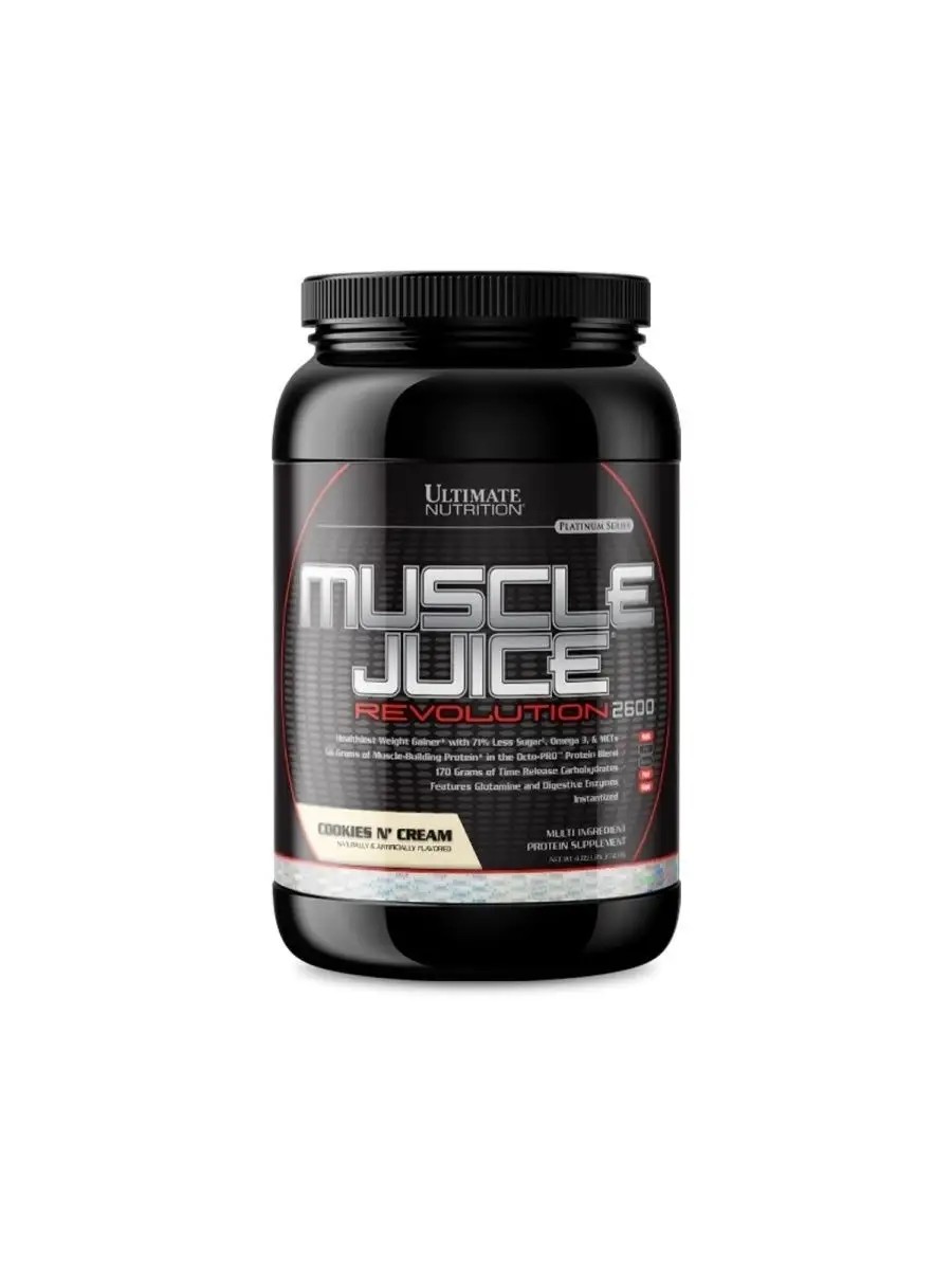 Ultimate Nutrition's Muscle Juice Revolution is one of the most calorie-dense gainers available today. Each serving contains high-quality protein, premium carbohydrates, and a variety of essential fatty acids, including omega-3 fish oil, which is essential for building cell membranes, and medium-chain triglycerides (MCT fats), which provide energy. Glutamine and L-alanyl-L-glutamine accelerate recovery after strength training. Contains sufficient protein for rapid muscle growth and faster recovery after training, as the blend consists of different types of protein: whey protein concentrate, whey protein isolate, milk protein isolate, whey protein hydrolysate, egg white isolate, micellar casein, milk protein concentrate, and calcium caseinate. Muscle Juice Revolution is unrivaled quality and will help you achieve your goals! The product contains a packet with a moisture-retaining agent. Be careful!
