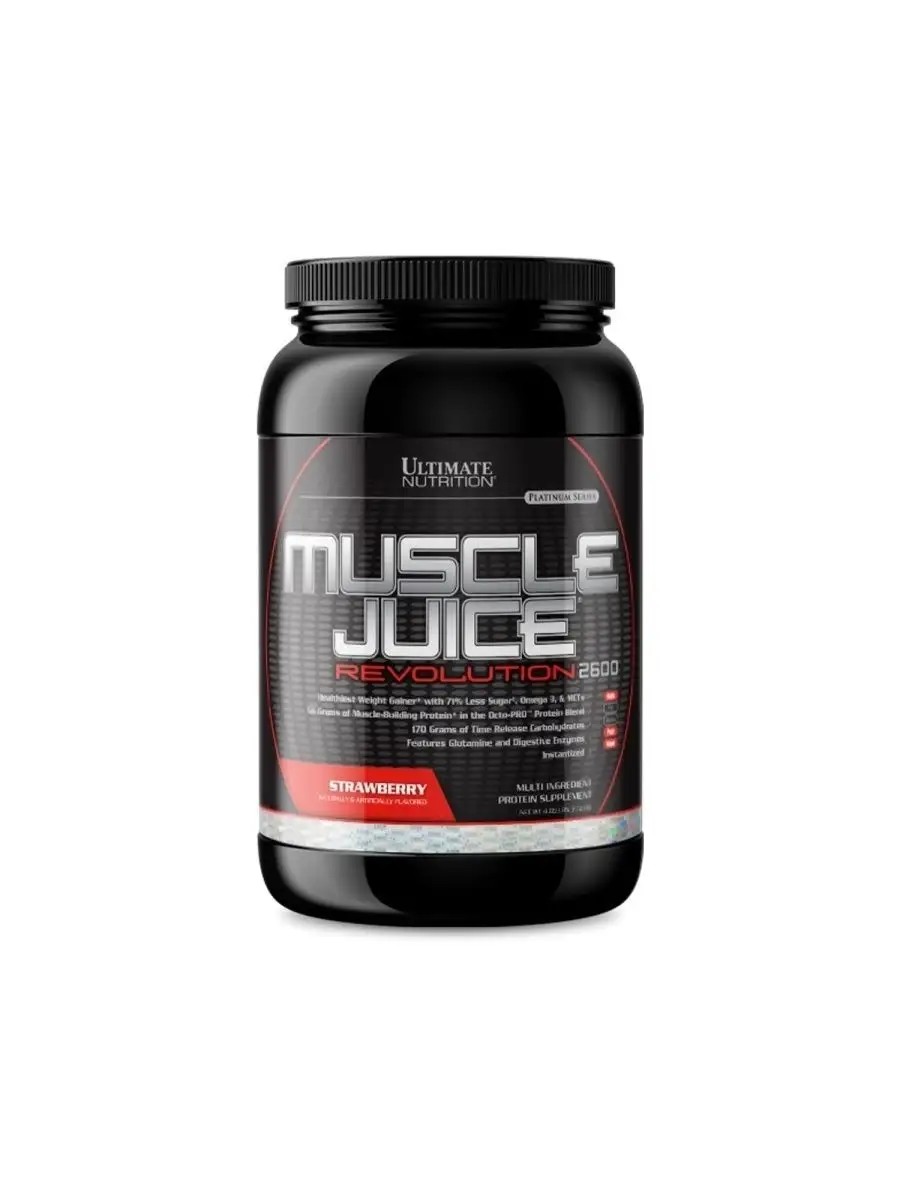 Ultimate Nutrition's Muscle Juice Revolution is one of the most calorie-dense gainers available today. Each serving contains high-quality protein, premium carbohydrates, and a variety of essential fatty acids, including omega-3 fish oil, which is essential for building cell membranes, and medium-chain triglycerides (MCT fats), which provide energy. Glutamine and L-alanyl-L-glutamine accelerate recovery after strength training. Contains sufficient protein for rapid muscle growth and faster recovery after training, as the blend consists of different types of protein: whey protein concentrate, whey protein isolate, milk protein isolate, whey protein hydrolysate, egg white isolate, micellar casein, milk protein concentrate, and calcium caseinate. Muscle Juice Revolution is unrivaled quality and will help you achieve your goals! The product contains a packet with a moisture-retaining agent. Be careful!