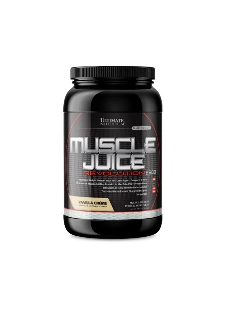 Ultimate Nutrition's Muscle Juice Revolution is one of the most calorie-dense gainers available today. Each serving contains high-quality protein, premium carbohydrates, and a variety of essential fatty acids, including omega-3 fish oil, which is essential for building cell membranes, and medium-chain triglycerides (MCT fats), which provide energy. Glutamine and L-alanyl-L-glutamine accelerate recovery after strength training. Contains sufficient protein for rapid muscle growth and faster recovery after training, as the blend consists of different types of protein: whey protein concentrate, whey protein isolate, milk protein isolate, whey protein hydrolysate, egg white isolate, micellar casein, milk protein concentrate, and calcium caseinate. Muscle Juice Revolution is unrivaled quality and will help you achieve your goals! The product contains a packet with a moisture-retaining agent. Be careful!